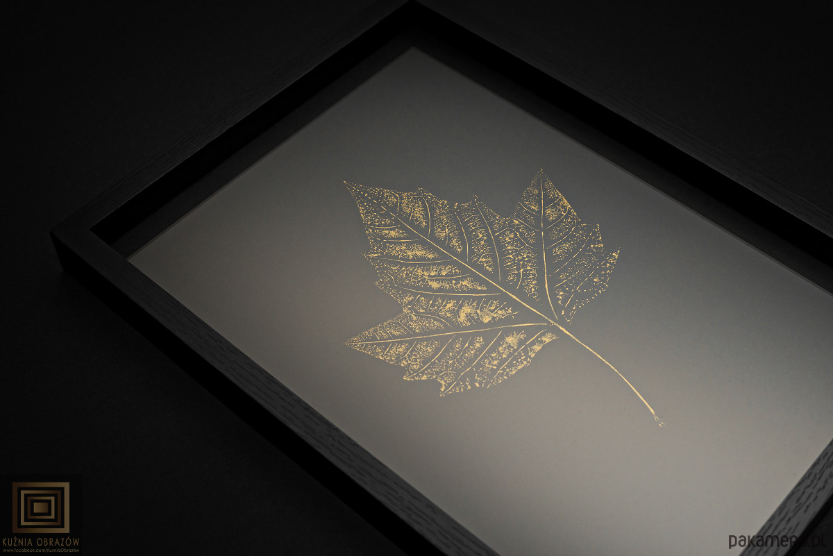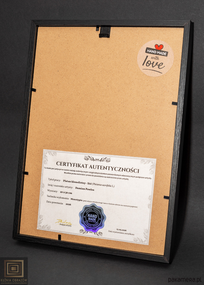 Złoty liść platana klonolistnego – autorska grafika rękodzielnicza