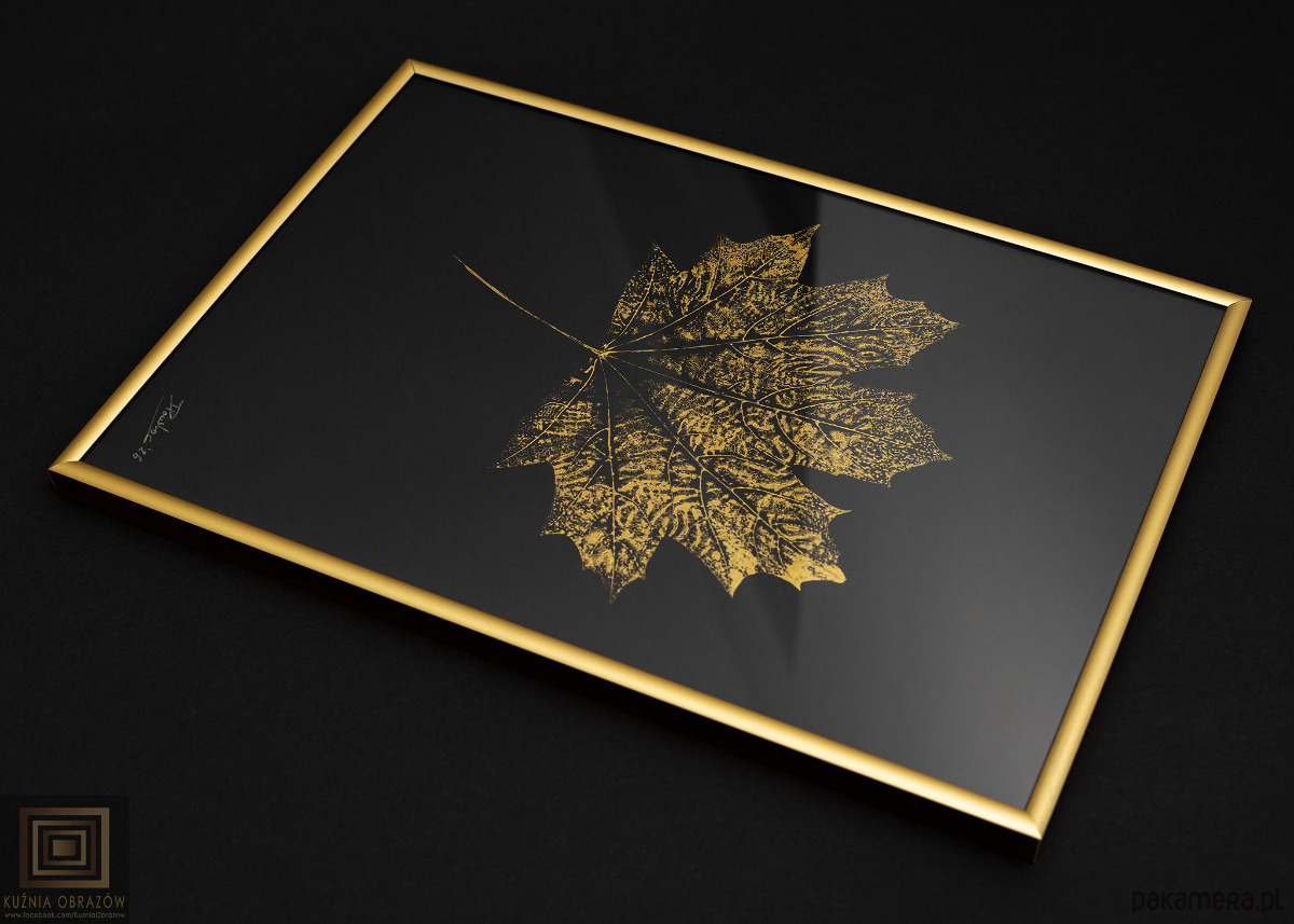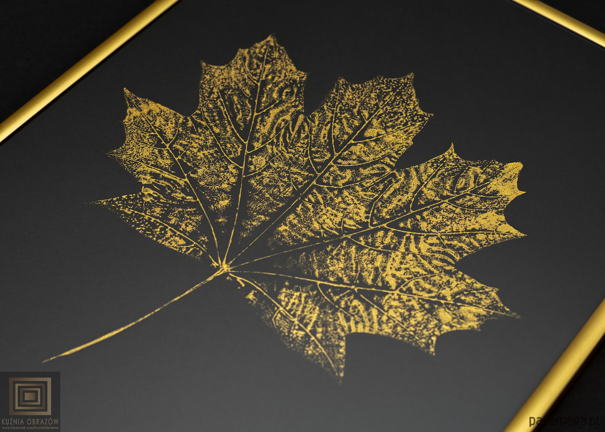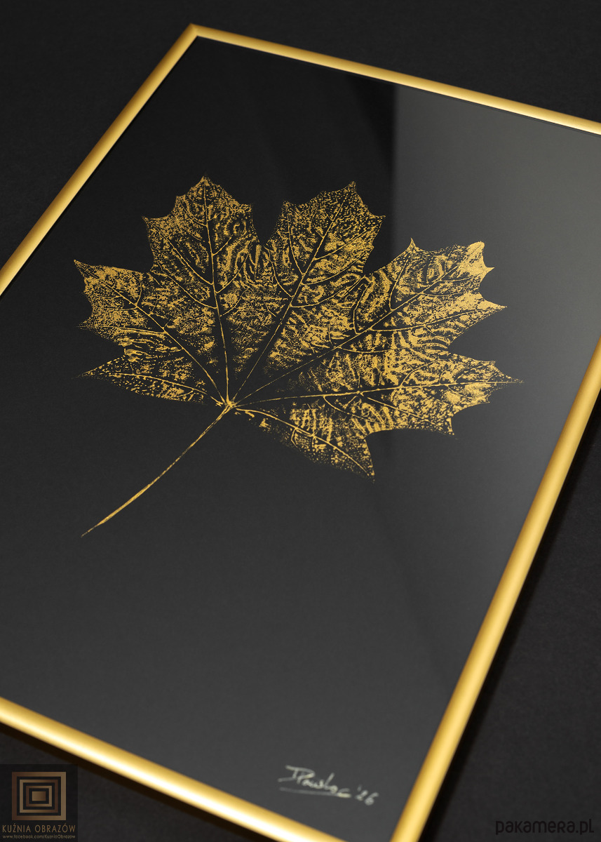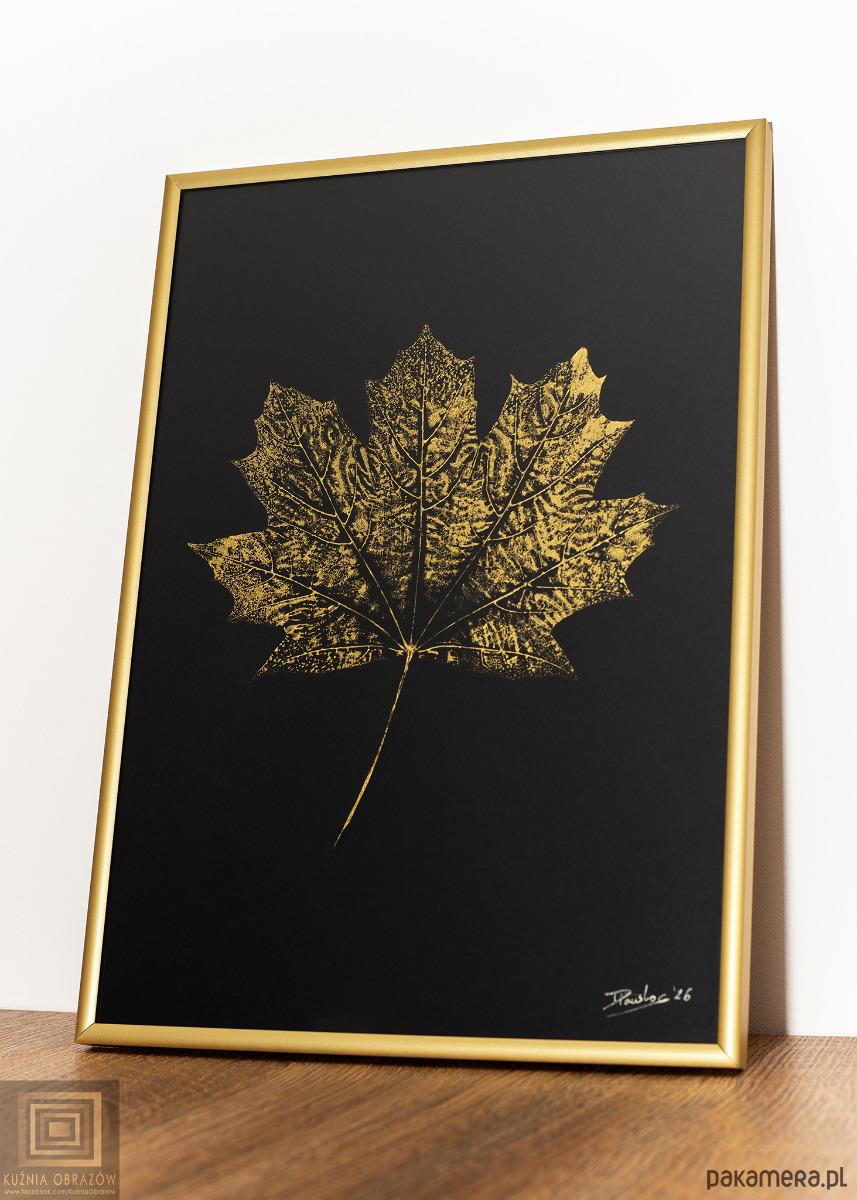 Autorska Grafika Botaniczna. Złoty Plakat Liść Klonu 20x30cm. Złota Rama Alu