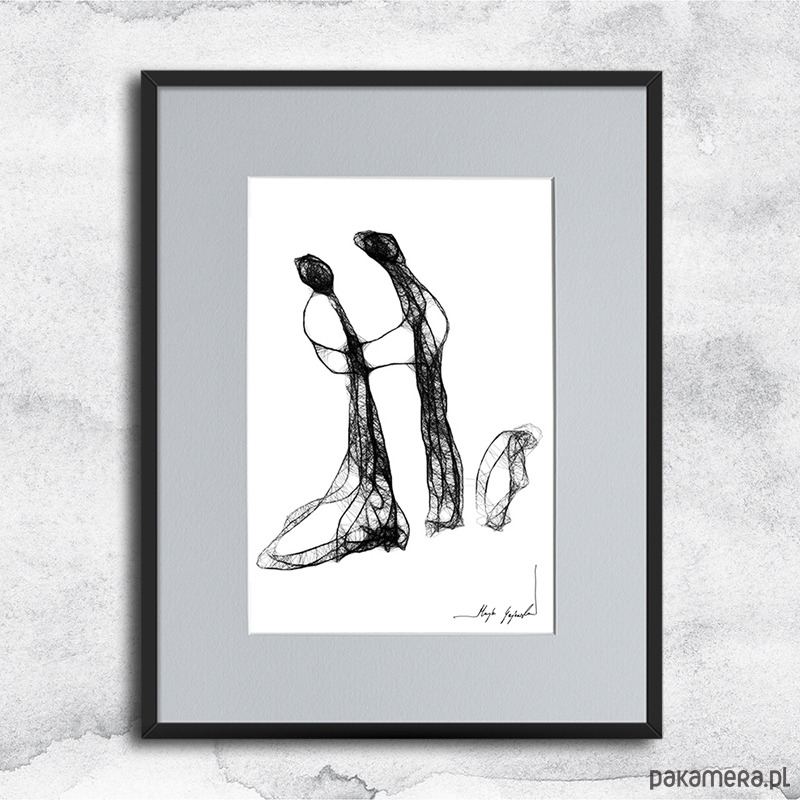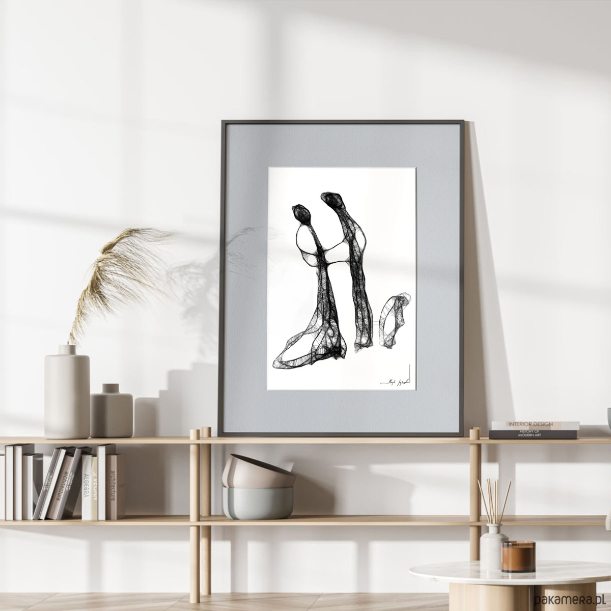 Autorska grafika wykonana techniką mieszaną (giclée+rysunek isografem) na białym, matowym o lekko fakturowanej powierzchni, graficznym papierze Canson 250g. Unikalna kreska wygląda bardzo efektownie, zaś czarno-białe wykończenia wnętrz idealnie wpisują się puste w ściany nowoczesnych, minimalistycznych czy loftowych powierzchni.