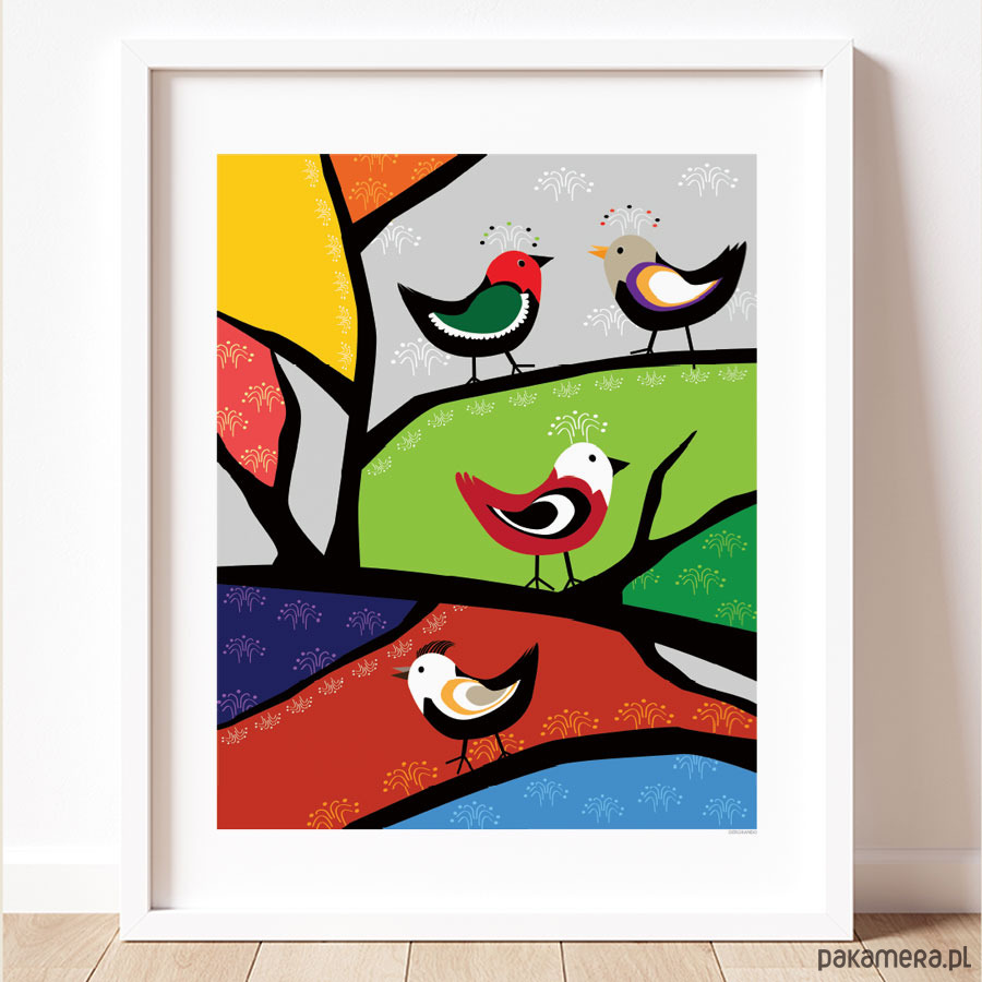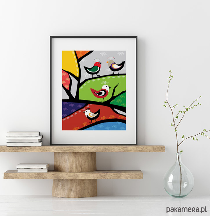 Kolorowy i radosny plakat z uroczymi ptaszkami to bardzo przyjemna dekoracja ścienna. Pasuje do pokoju dziennego, salonu, gabinetu, a także do dziecięcego pokoju. Autorska ilustracja, wysoka jakość wydruku. Plakat drukowany jest z białym marginesem (passe partout), który różni się w zależności od wymiarów plakatu. Zapraszam do obejrzenia galerii zdjęć.