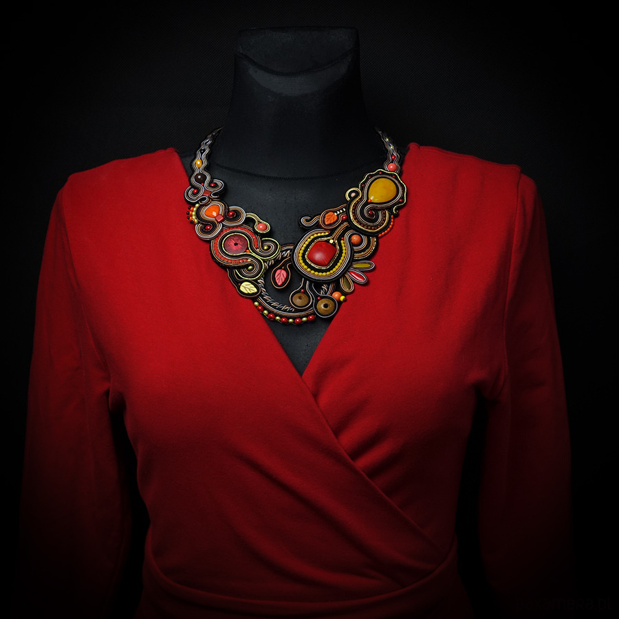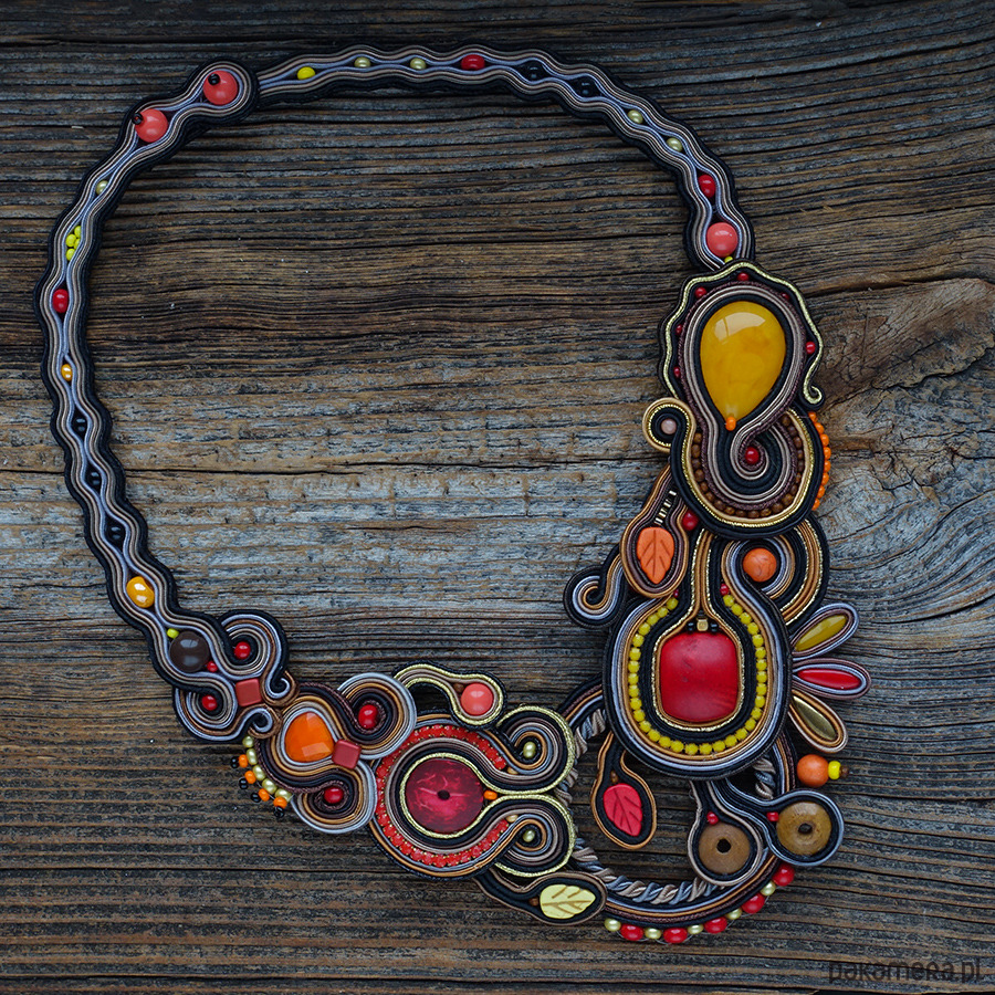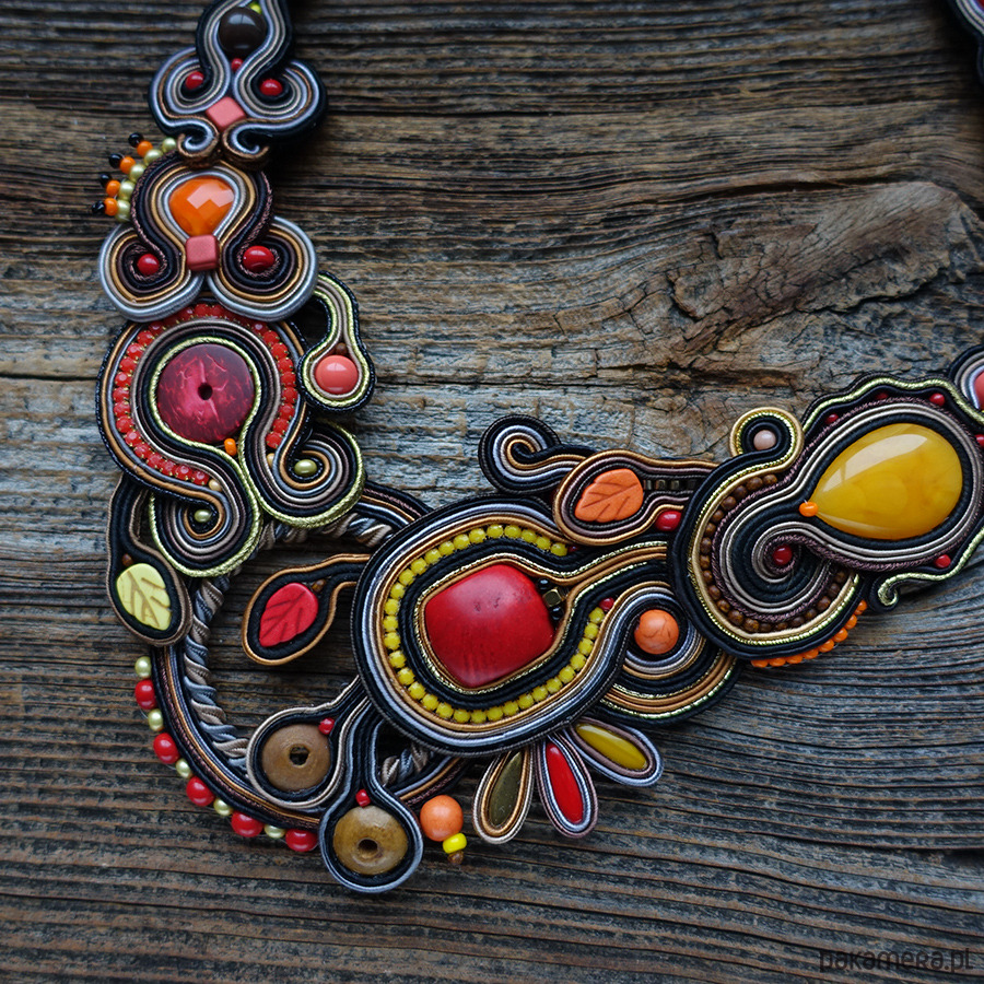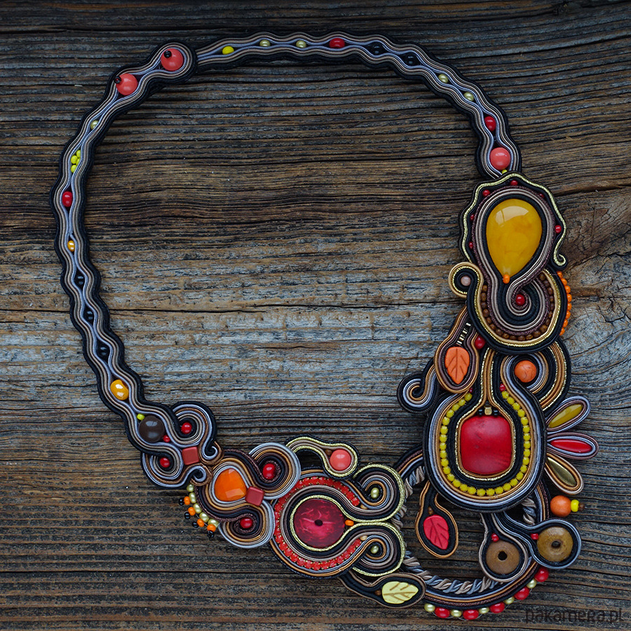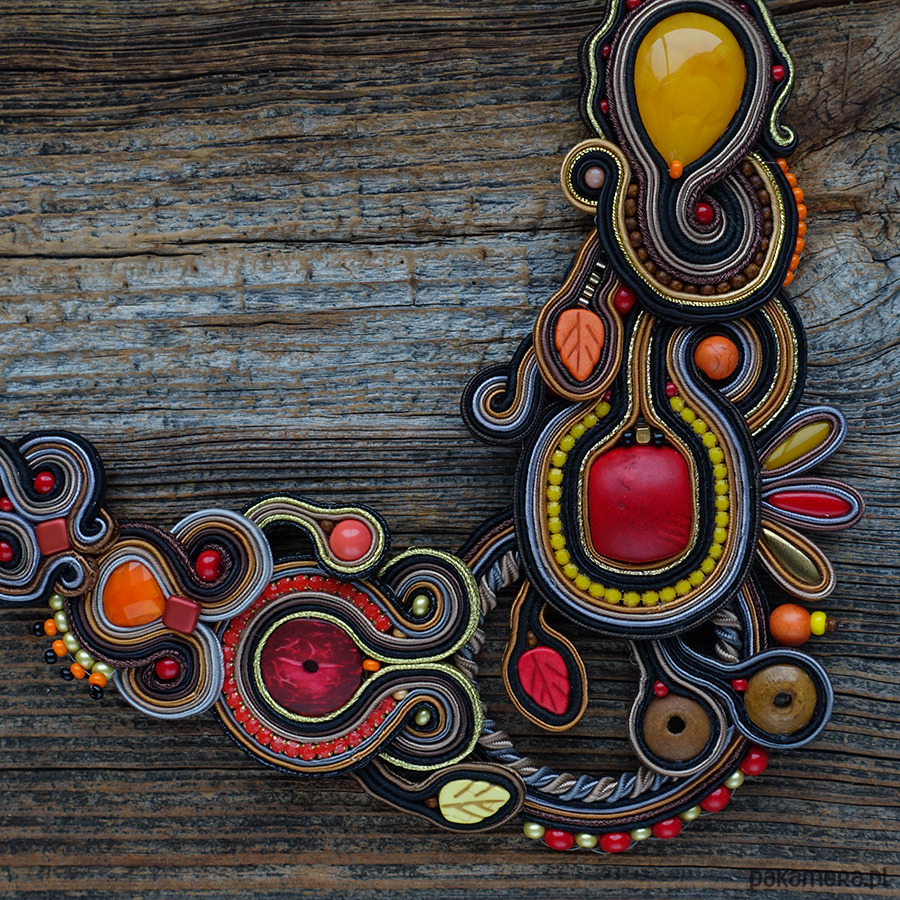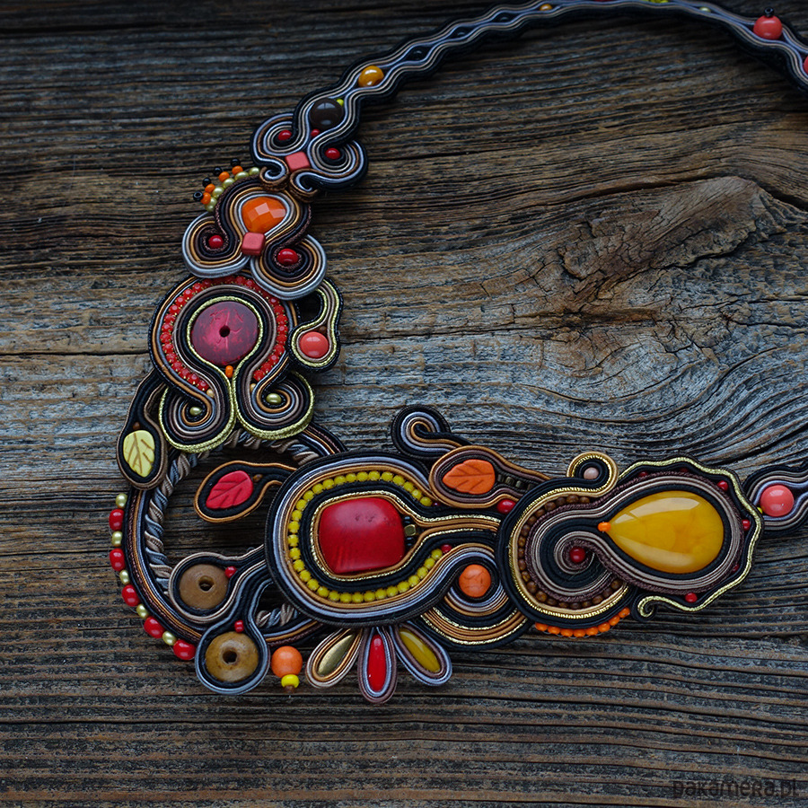 Niepowtarzalny naszyjnik wykonany ręcznie w technice haftu soutache. To pracochłonne dzieło idealnie podkreśli prostą sukienkę, klasyczną „małą czarną” czy miękki sweter – doda charakteru każdej stylizacji.