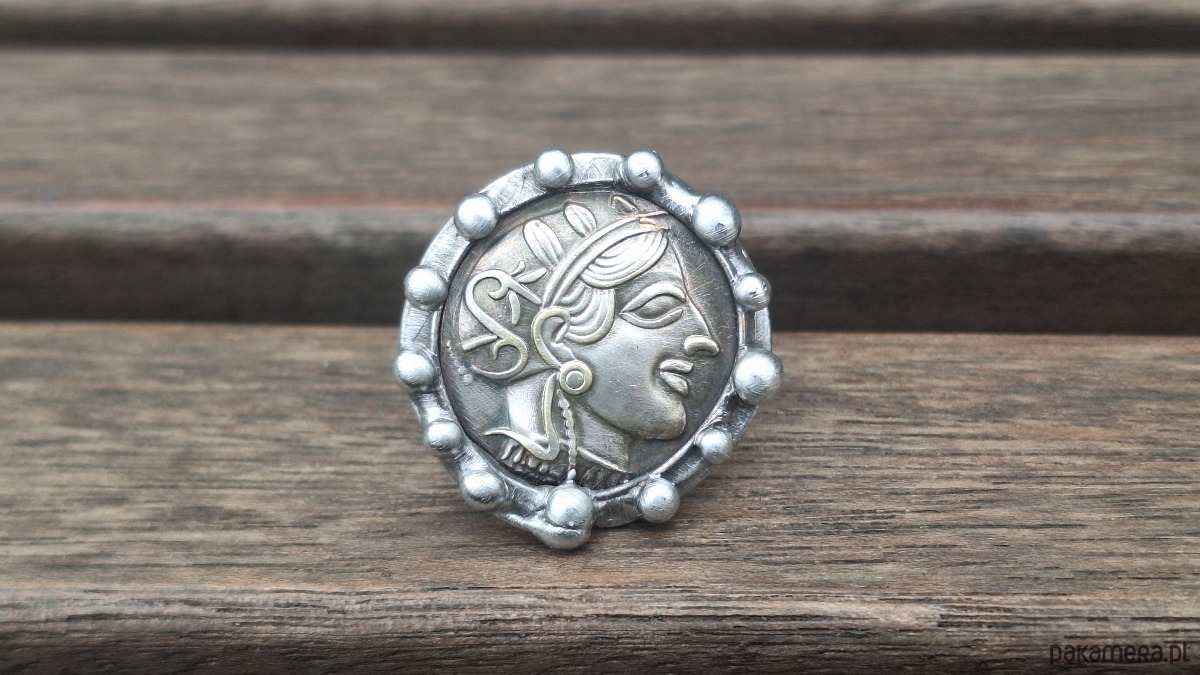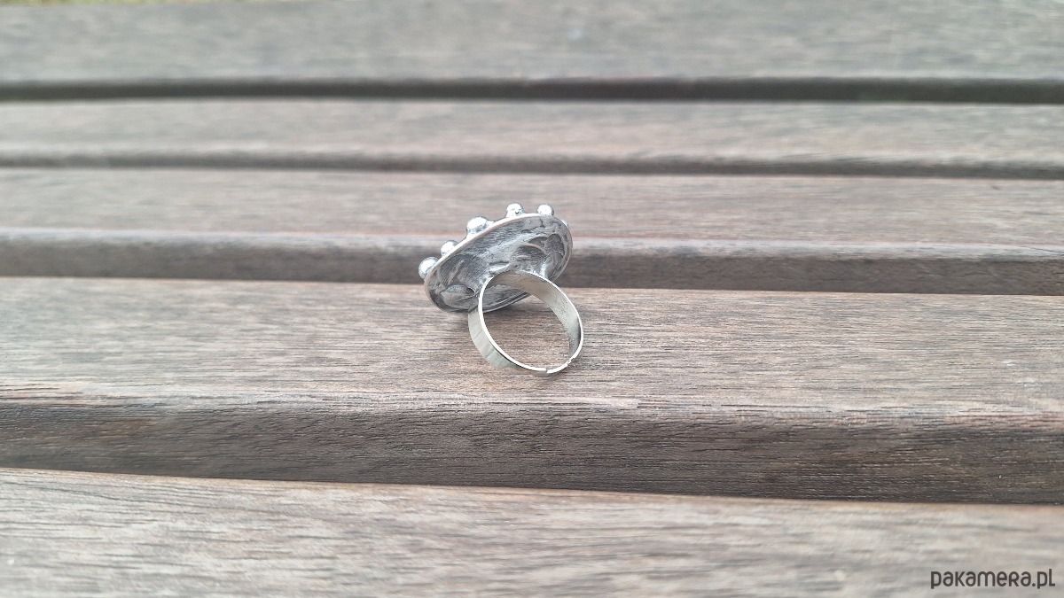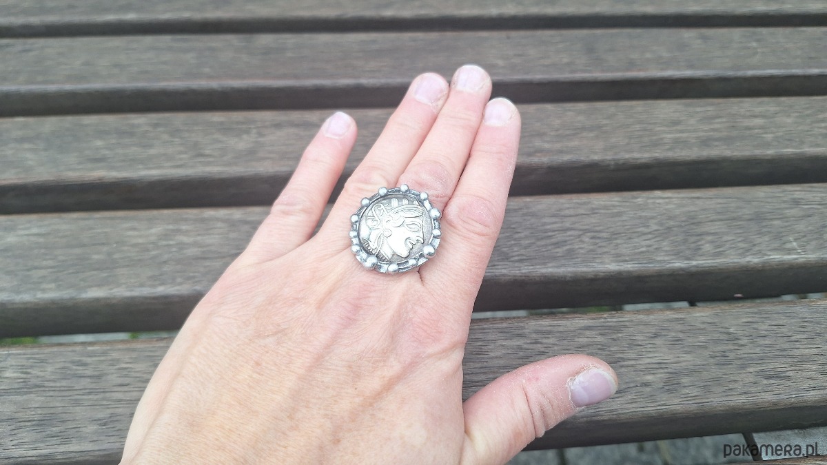 Pierścionek wykonany z miedzi, cyny i "starej monety". Wymiary ok. 2.7 na 2.7 cm. Regulowany. Nie jest ciężki.
