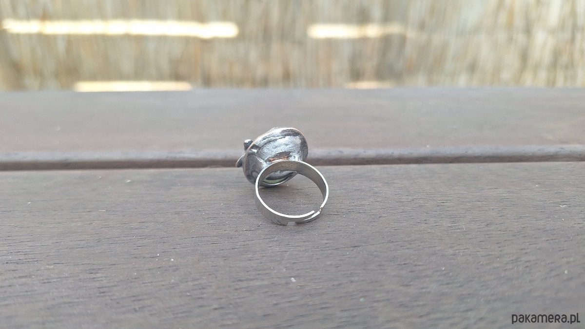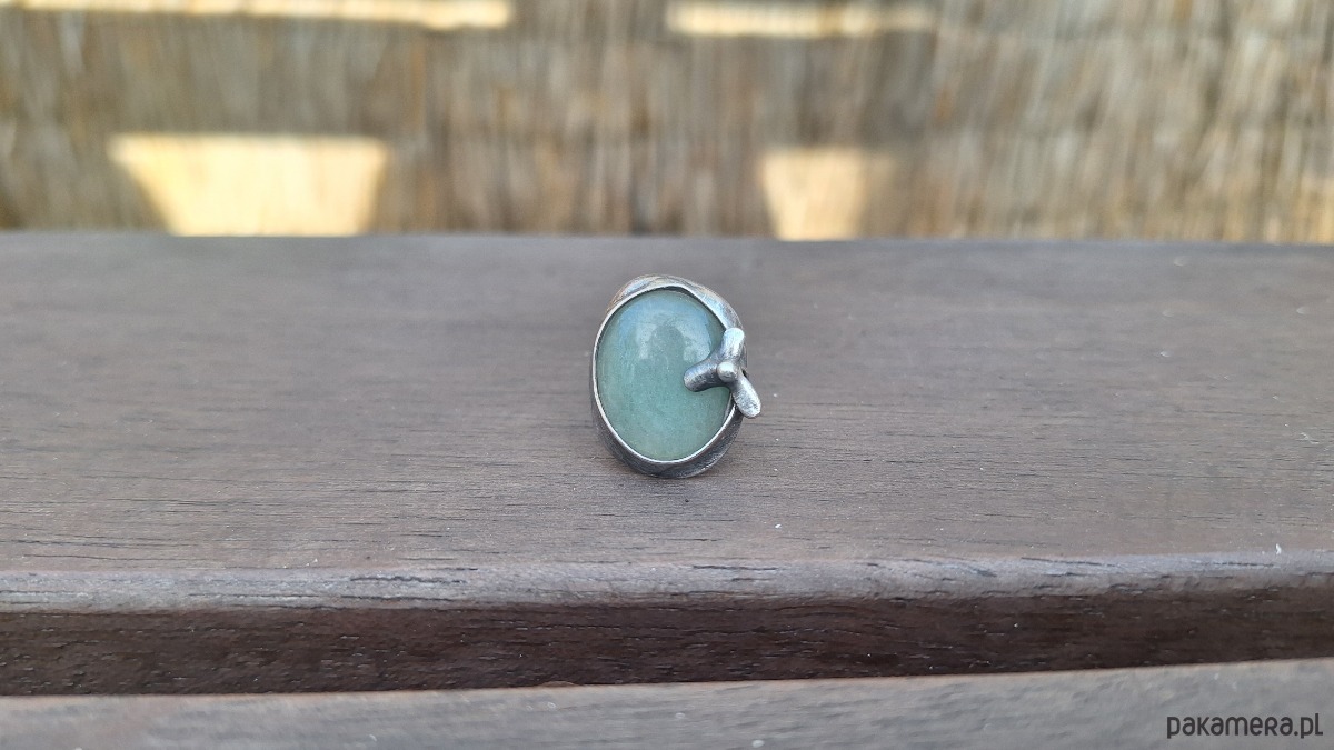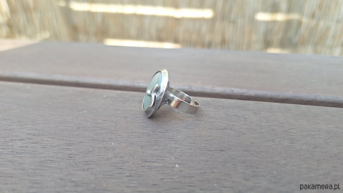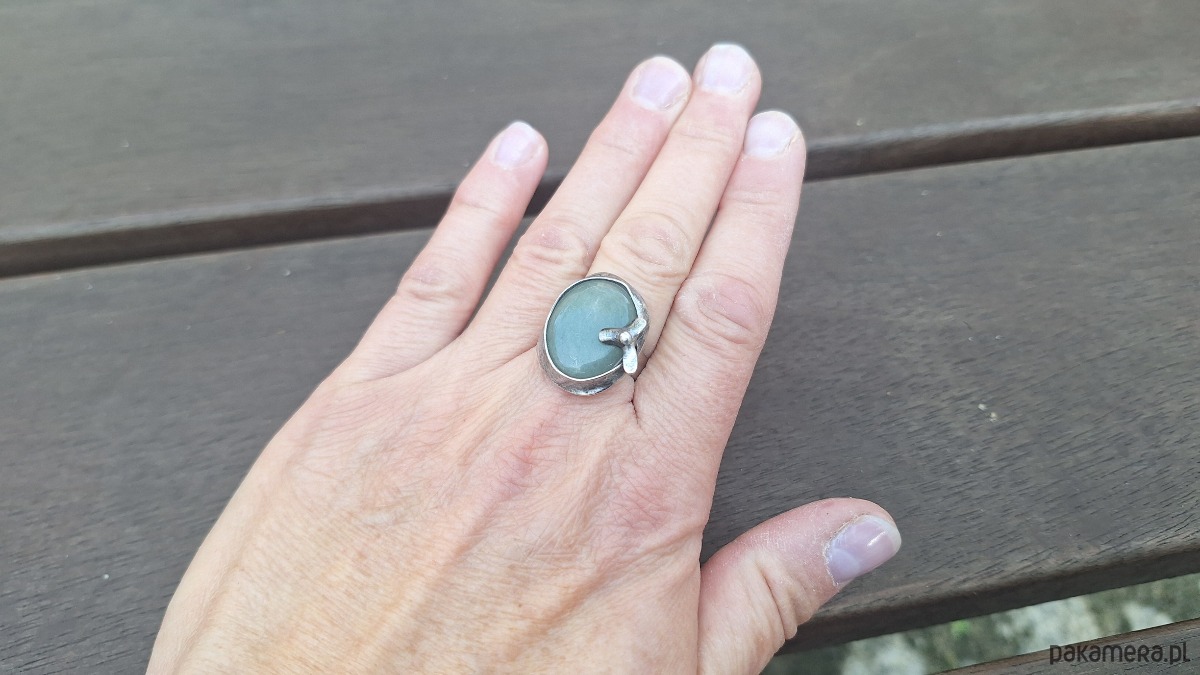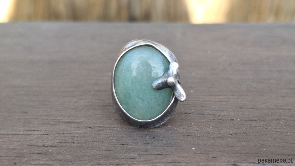 Pierścionek wykonany z miedzi, cyny i awenturynu. Wymiary ok. 2 na 1.7 cm. Regulowany. Nie jest ciężki.