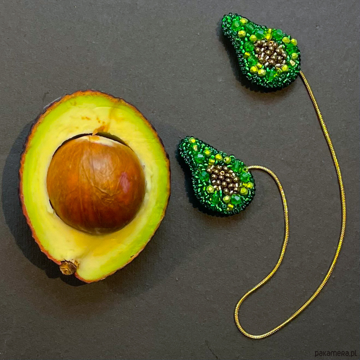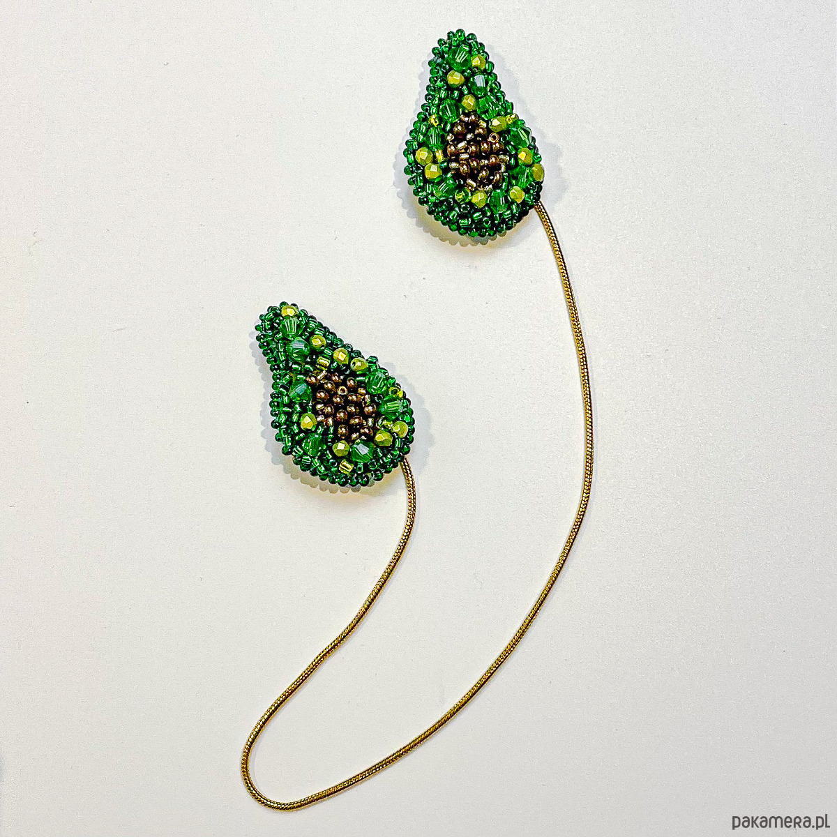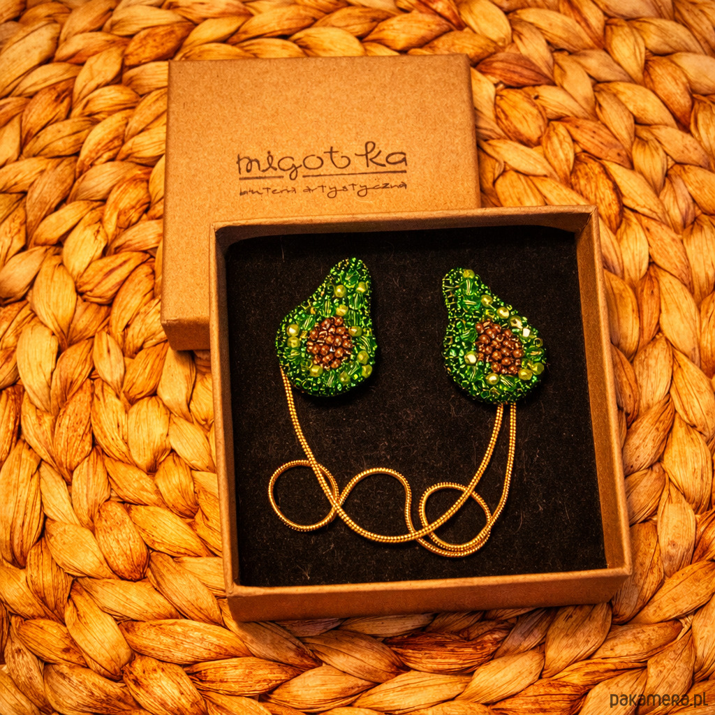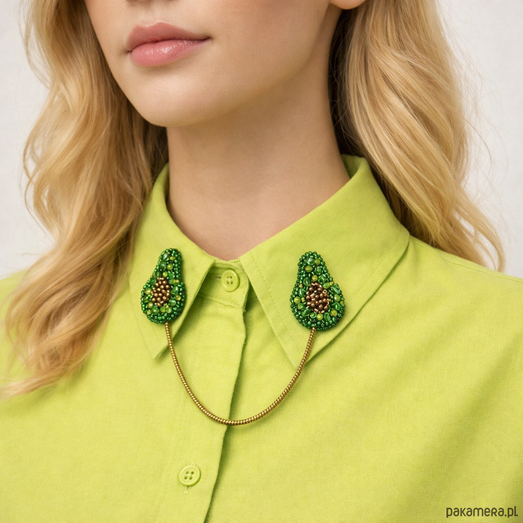 Unikatowy komplet dwóch broszek w kształcie awokado, ręcznie wykonanych z drobnych koralików i połączonych eleganckim łańcuszkiem. To biżuteria, która daje swobodę stylizacji i zabawę formą.