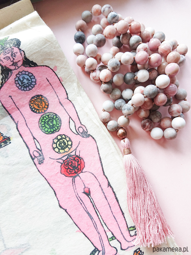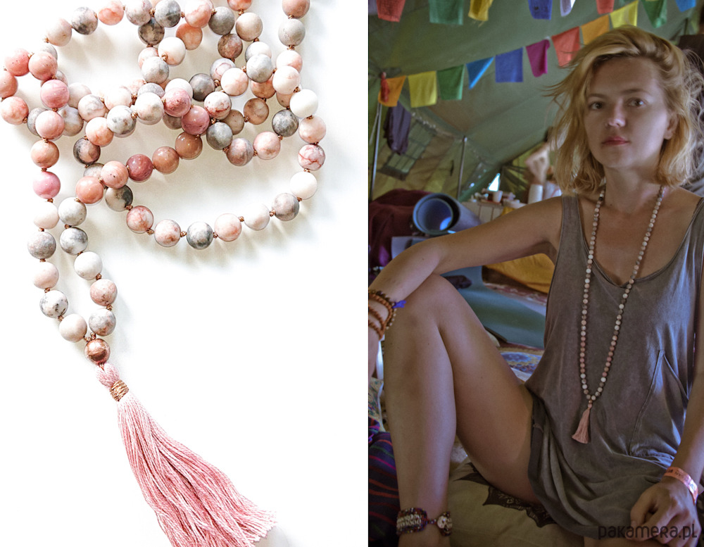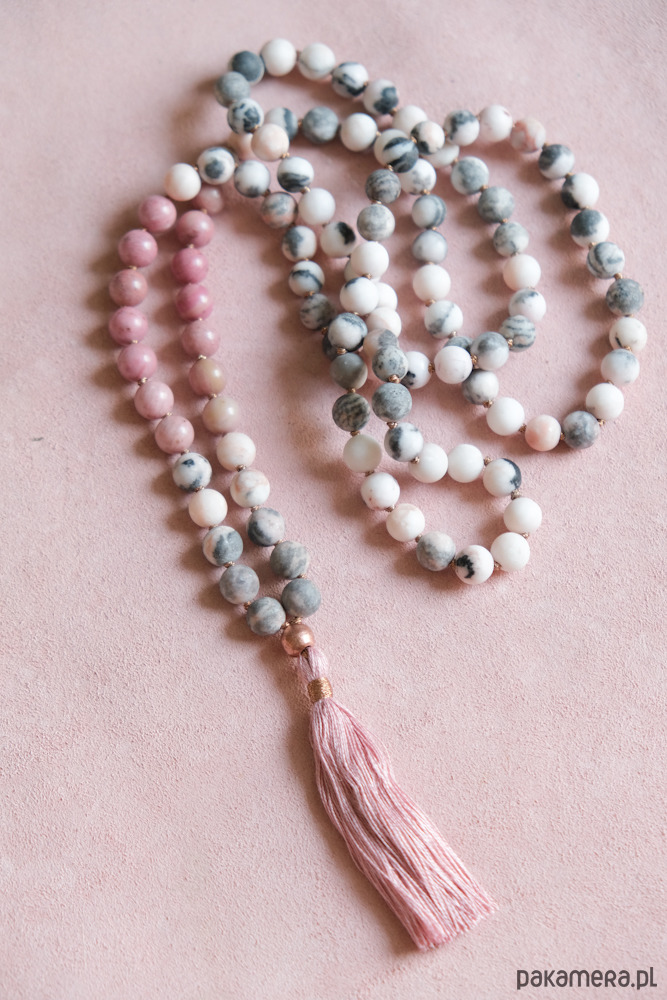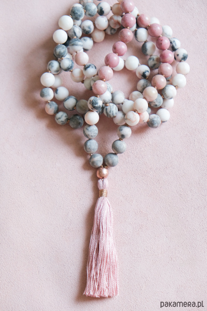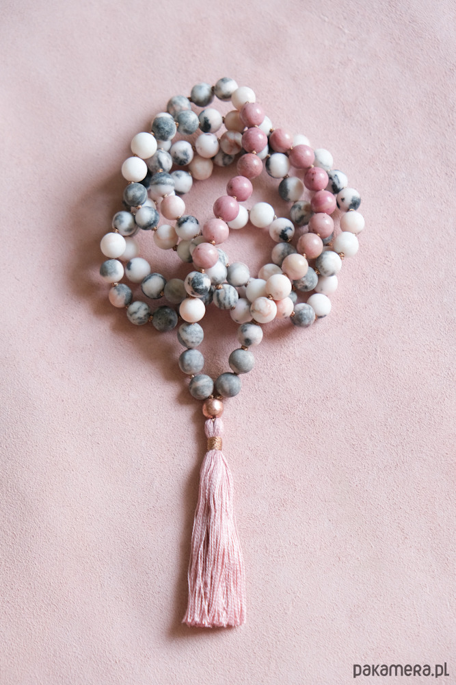 * naszyjnik wykonany na wzór medytacyjnej mali składa się z tradycyjnej ilości kamieni w ilości 108 sztuk - kamieni matowego jaspisu w niezwykłych odcieniach głownie szarości, bieli, również lekkiego różu oraz dodatku kilkunastu kamieni różowego rodonitu