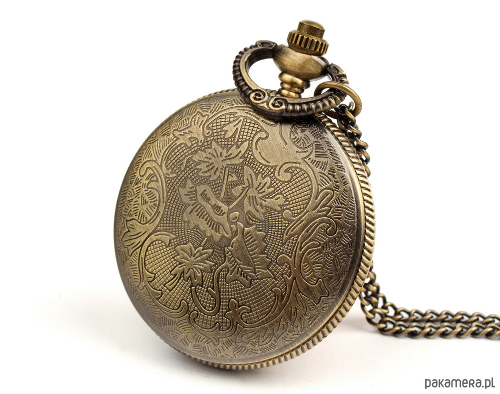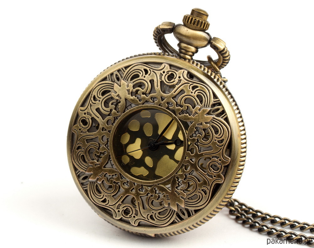 Przepiękny wisior charakteryzujący się ażurowym wykończeniem w kolorze starego złota. Wisior po otwarciu przyciskiem znajdującym się tuż przy pierścieniu, ukazuje bardzo czytelną tarczę zegarka z arabskimi cyframi. Przez otworek w przedniej ściance zegarka można podglądać wskazówki zegarka.