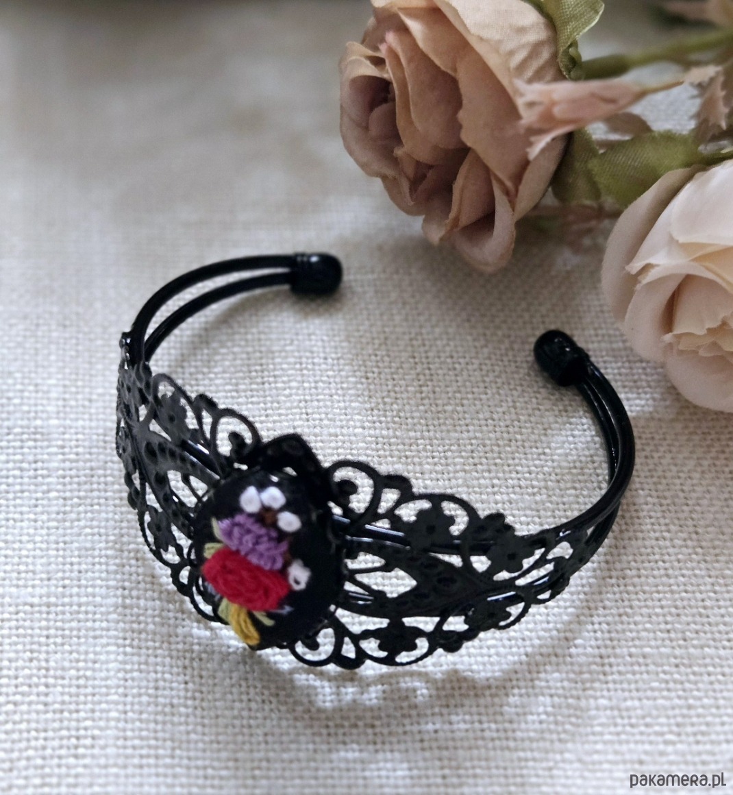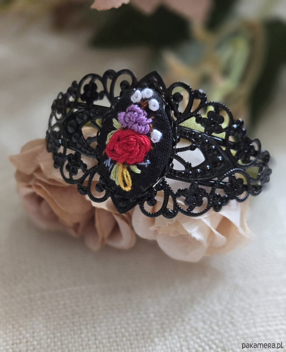 Ręcznie wyszywana bransoletka o średnicy 6,5 cm. Wykonana z czarnego, ażurowego metalu w formie otwartej obręczy nakładanej na nadgarstek.