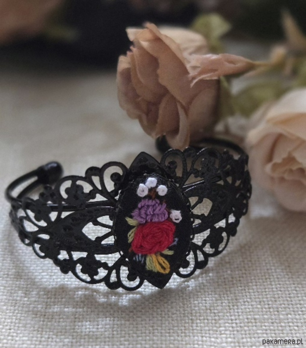 W centralnej części znajduje się owalna ozdoba z delikatnym haftem przedstawiającym kwiaty w odcieniach czerwieni, różu, żółci i zieleni. Bransoletka łączy w sobie styl vintage z romantycznym, rękodzielniczym charakterem, stanowiąc wyjątkowy dodatek do eleganckich i codziennych stylizacji.