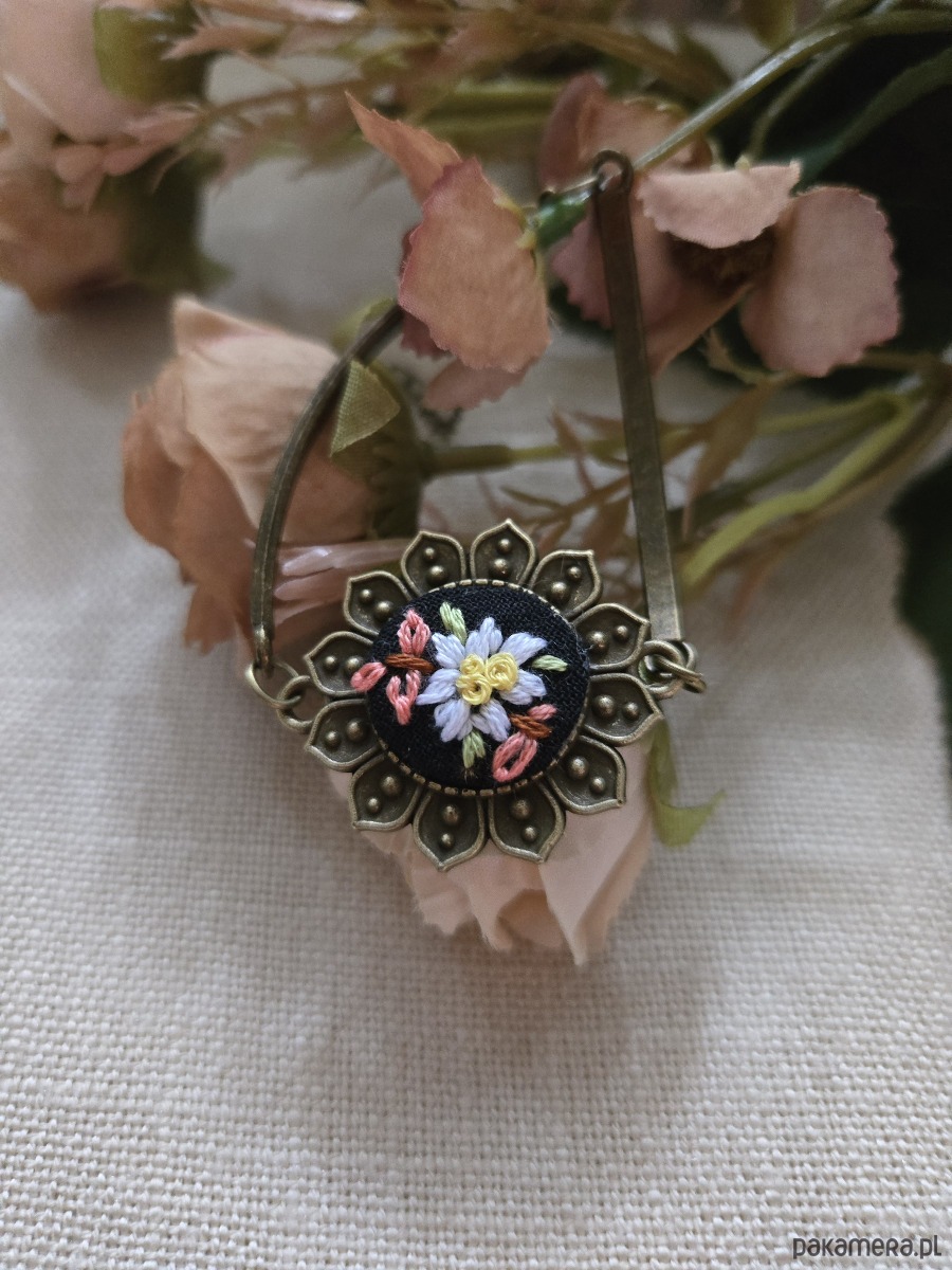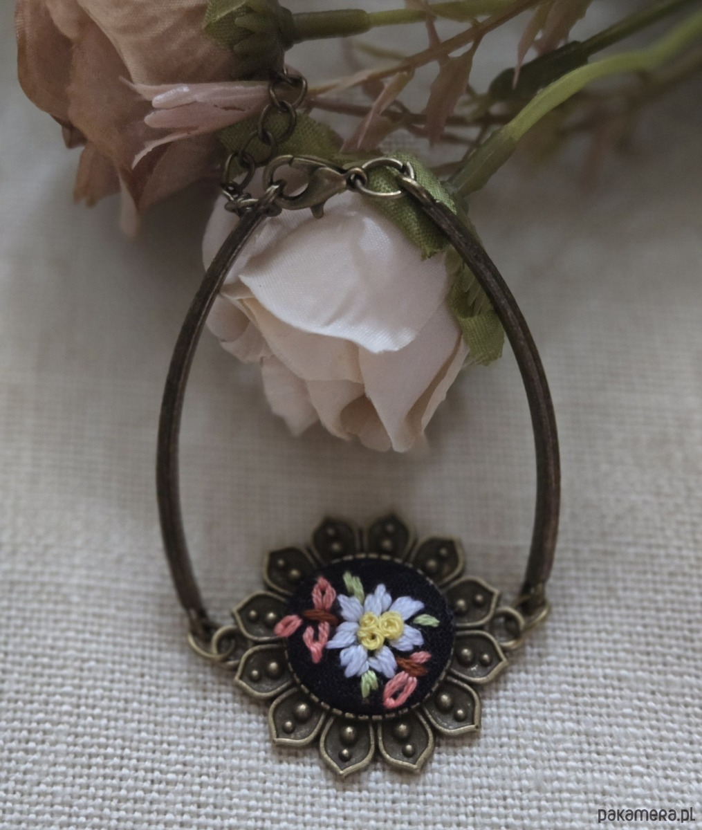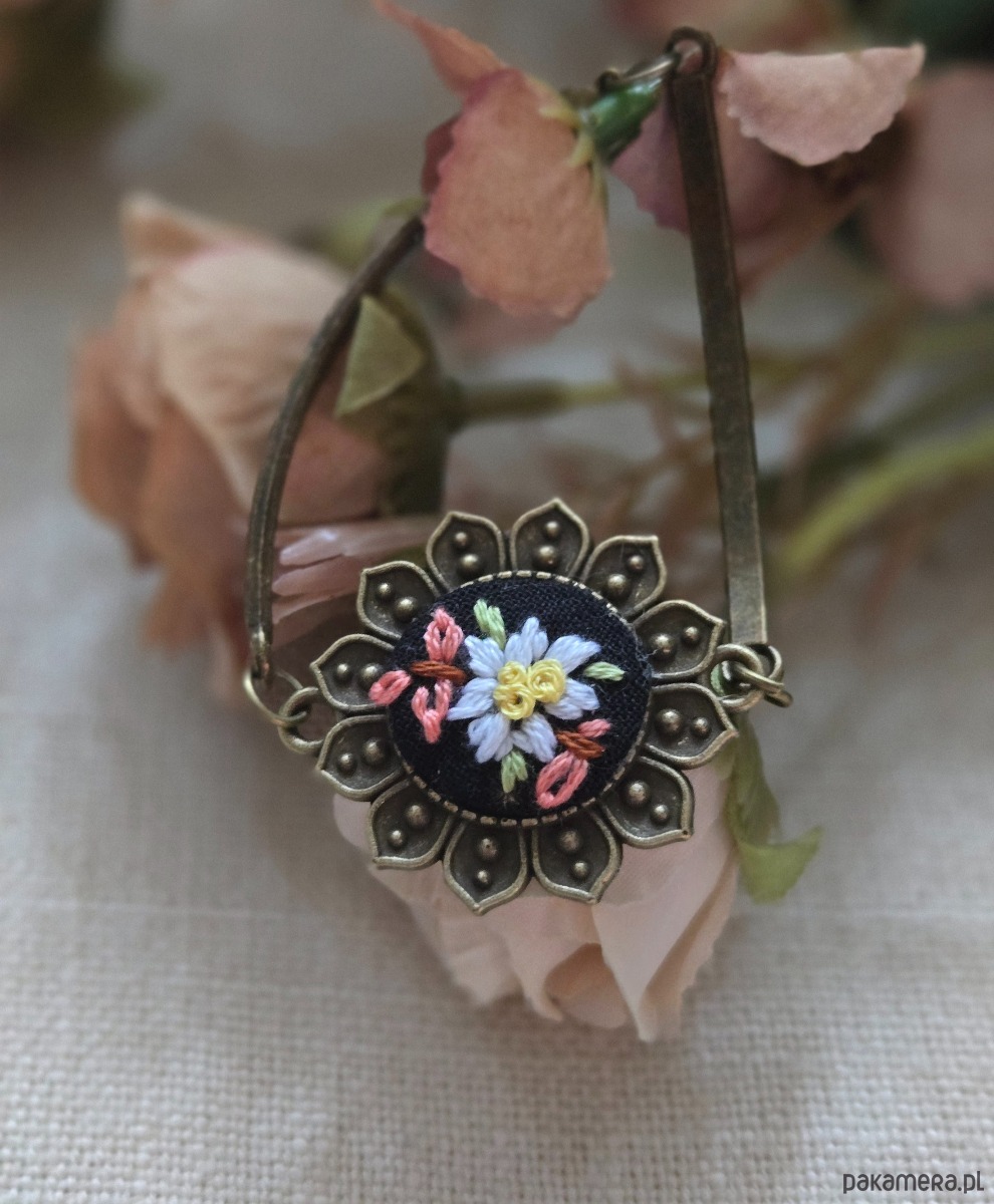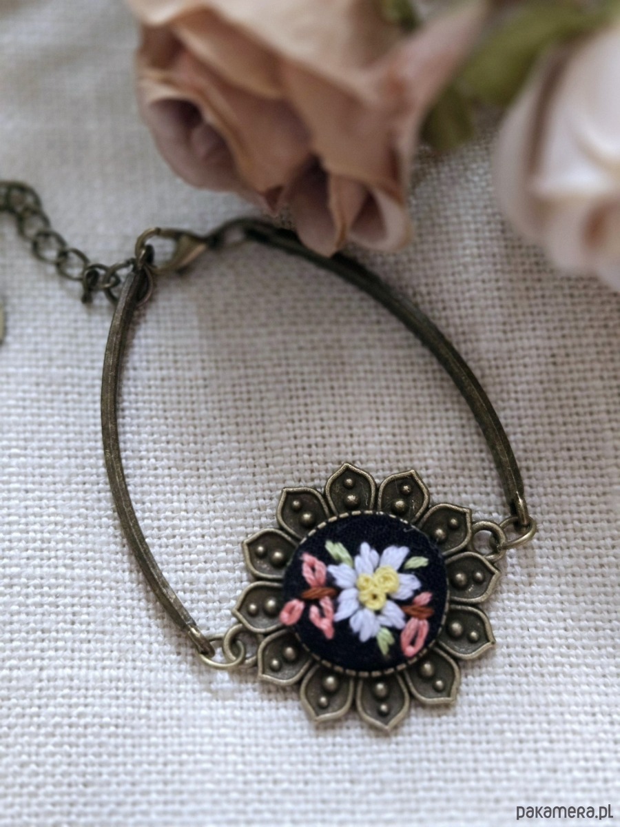 Ręcznie wyszywana bransoletka o delikatnym, kobiecym charakterze. Wykonana z metalu w kolorze starego złota, z ozdobnym, kwiatowym elementem w kształcie rozety. W centralnej części znajduje się haft przedstawiający drobne kwiaty w odcieniach bieli, różu, żółci i zieleni.
