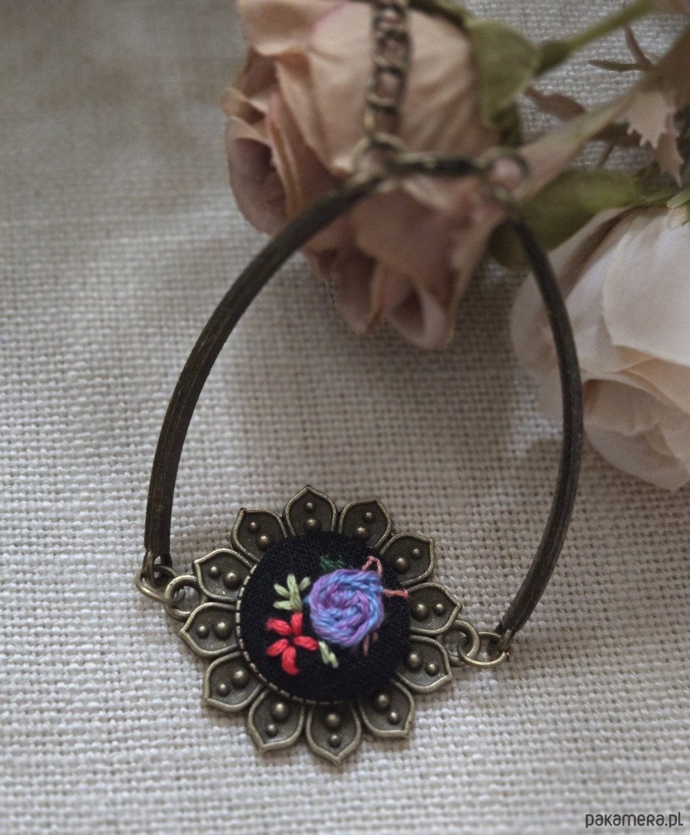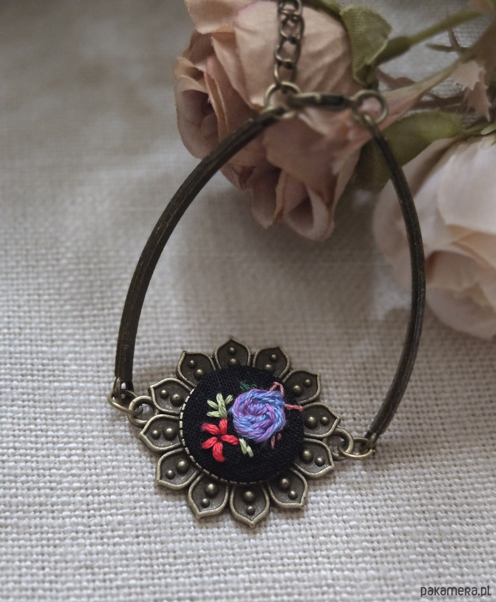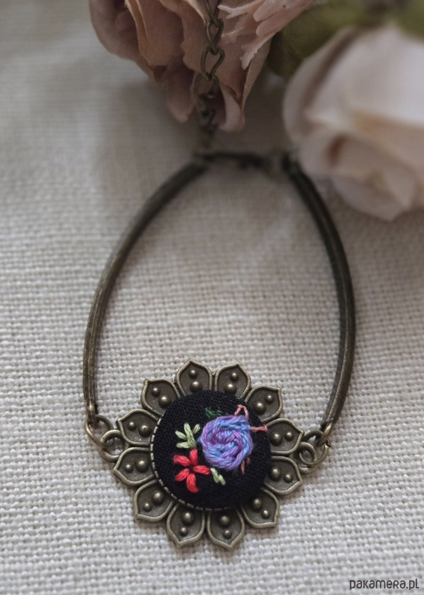 Ręcznie wyszywana bransoletka o delikatnym, kobiecym charakterze. Wykonana z metalu w kolorze starego złota, z ozdobnym, kwiatowym elementem w kształcie rozety. W centralnej części znajduje się haft przedstawiający drobne kwiaty w odcieniach fioletu, niebieskiego, czerwonego i zieleni.
