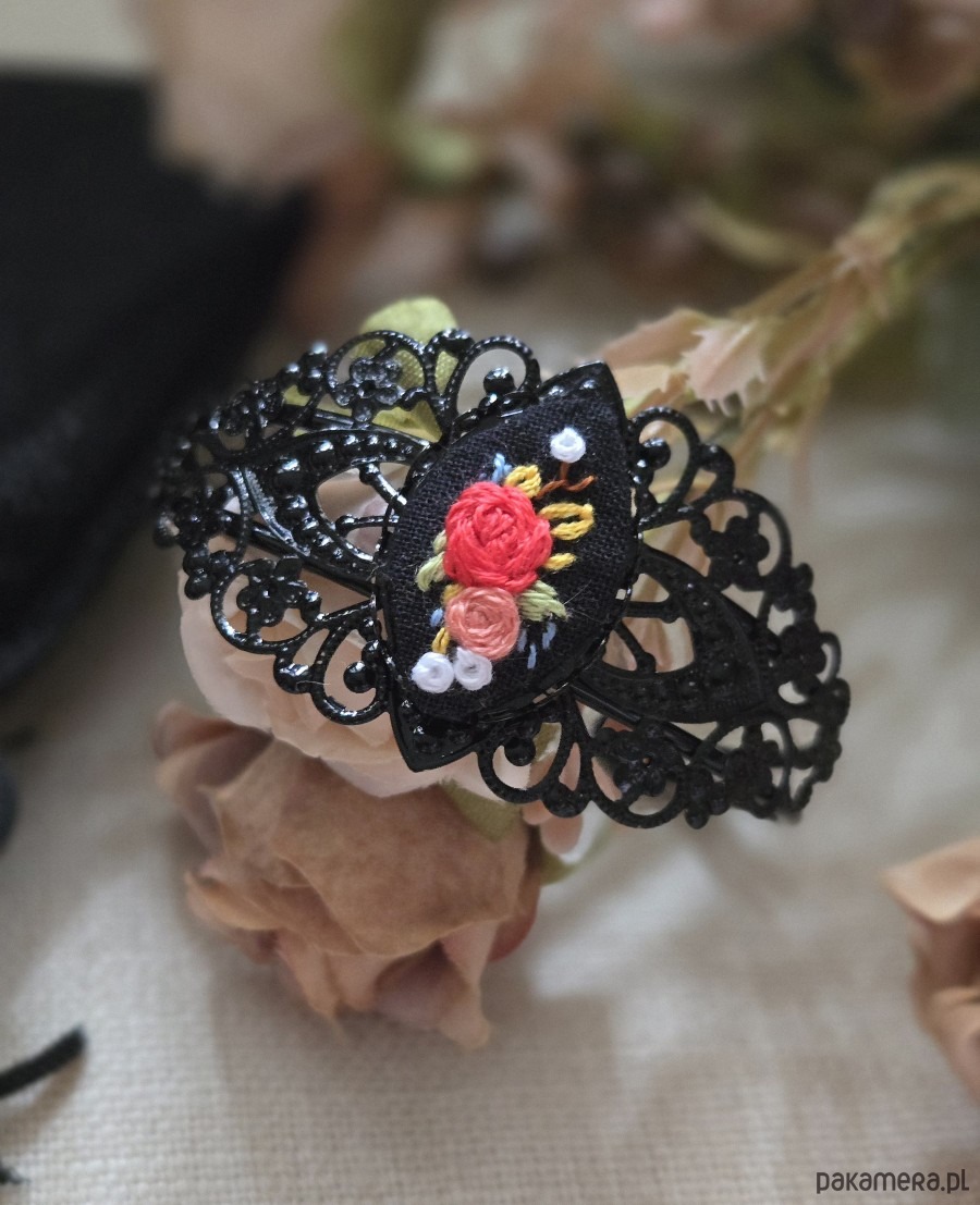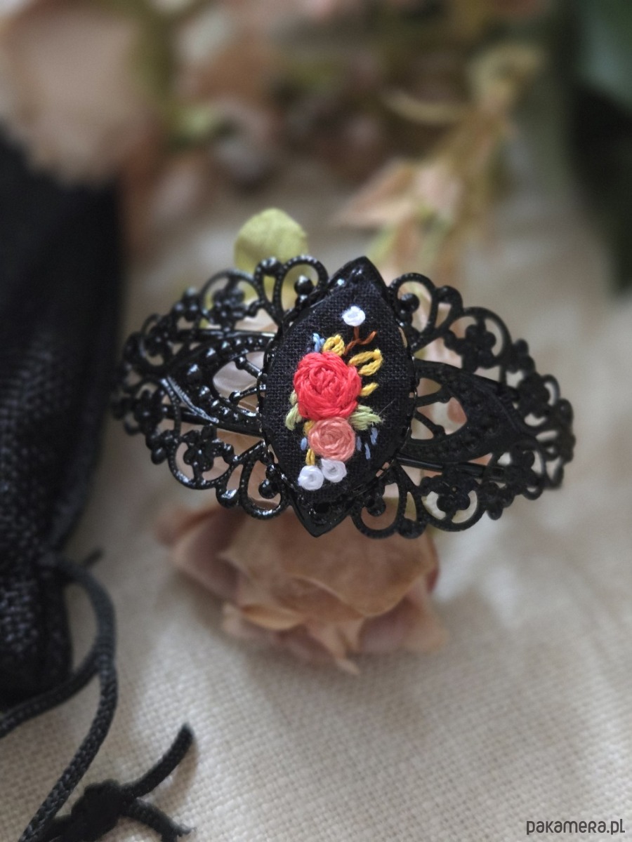 Ręcznie wyszywana bransoletka o średnicy 6,5 cm. Wykonana z czarnego, ażurowego metalu w formie otwartej obręczy nakładanej na nadgarstek.