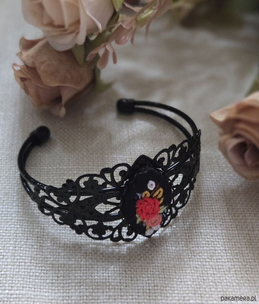W centralnej części znajduje się owalna ozdoba z delikatnym haftem przedstawiającym kwiaty w odcieniach czerwieni, różu, żółci i zieleni. Bransoletka łączy w sobie styl vintage z romantycznym, rękodzielniczym charakterem, stanowiąc wyjątkowy dodatek do eleganckich i codziennych stylizacji.