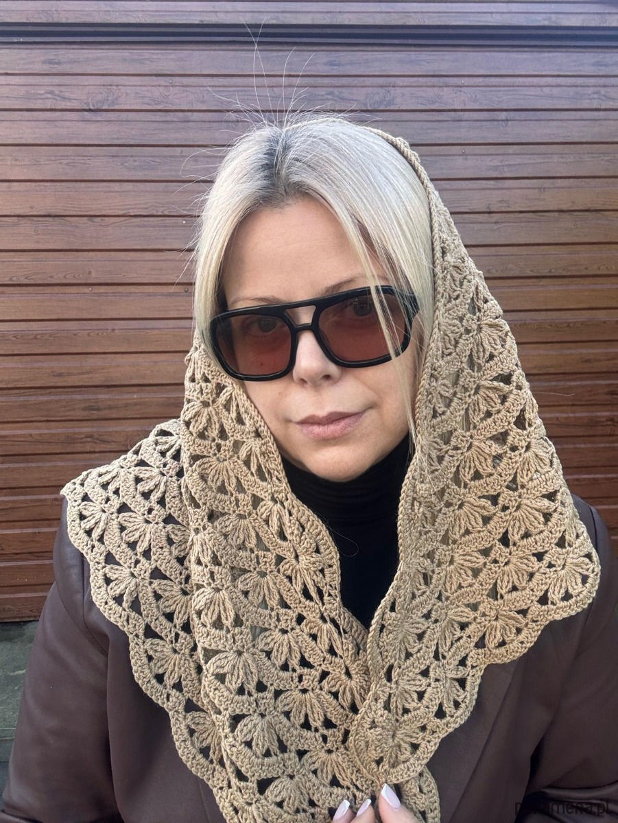 Miękka, otulająca i niezwykle kobieca chusta wykonana ręcznie na szydełku z wysokiej jakości wełny merino.