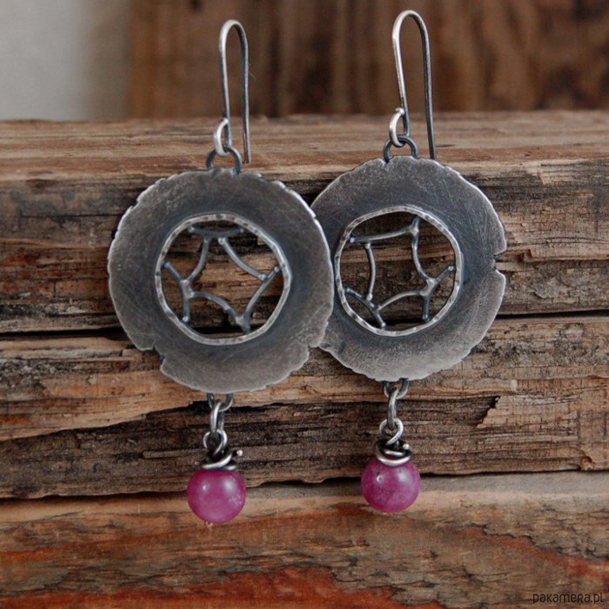 Srebrne kolczyki z rubinami. Srebro oksydowane. Średnica kamieni 0,7 cm, szerokość kolczyka 3 cm, długość 7 cm. Waga jednego kolczyka ok. 6,7 grama.