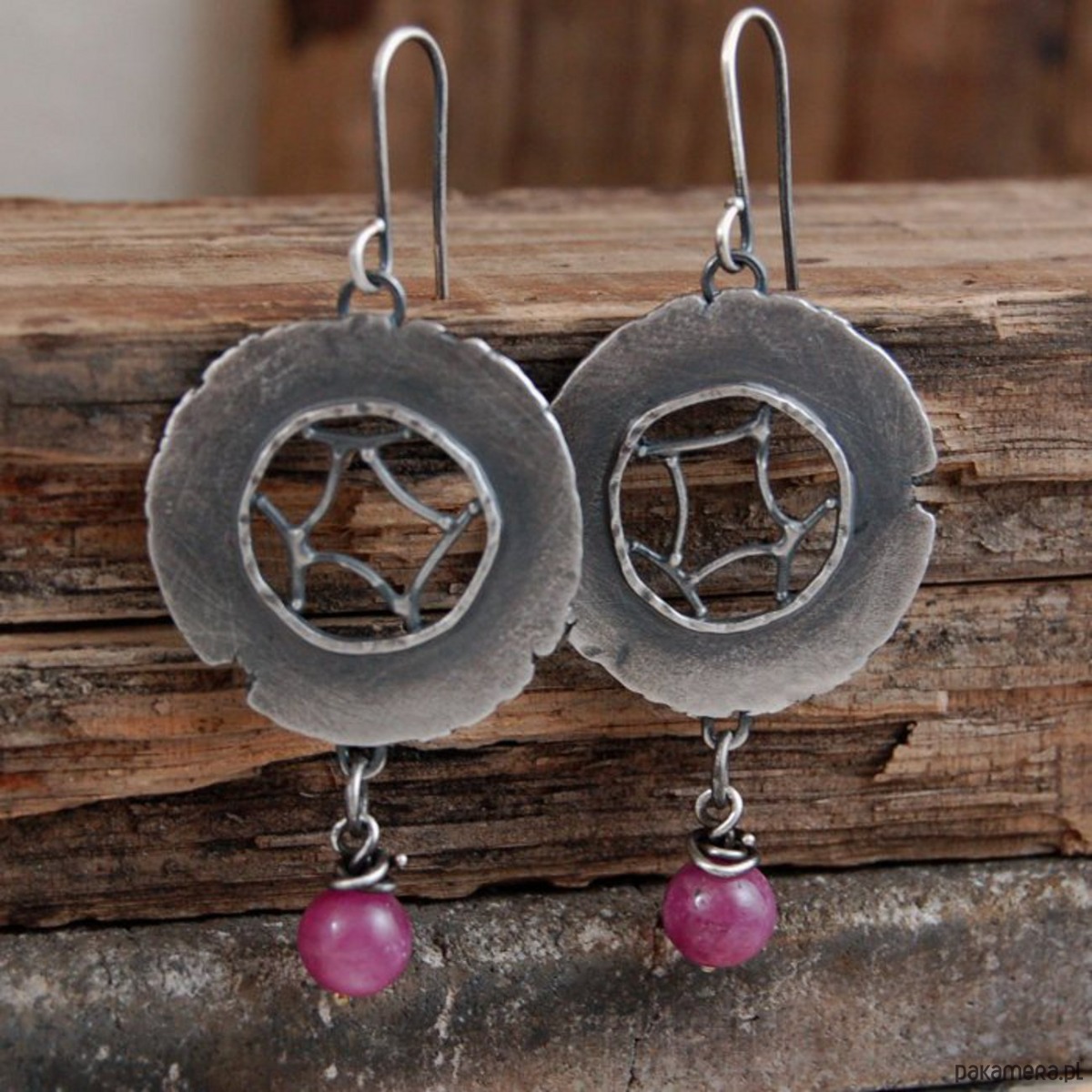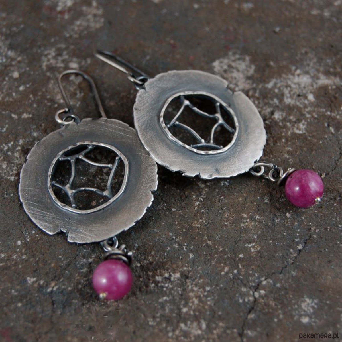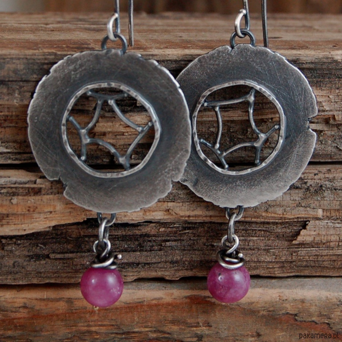 Srebrne kolczyki z rubinami. Srebro oksydowane. Średnica kamieni 0,7 cm, szerokość kolczyka 3 cm, długość 7 cm. Waga jednego kolczyka ok. 6,7 grama.
