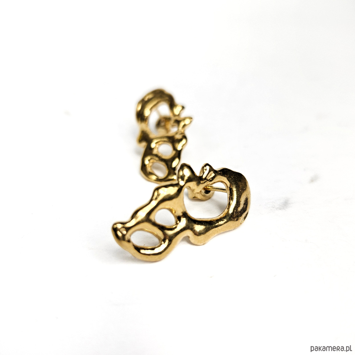 Pozłacane kolczyki w organicznej, nieregularnej ażurowej formie.