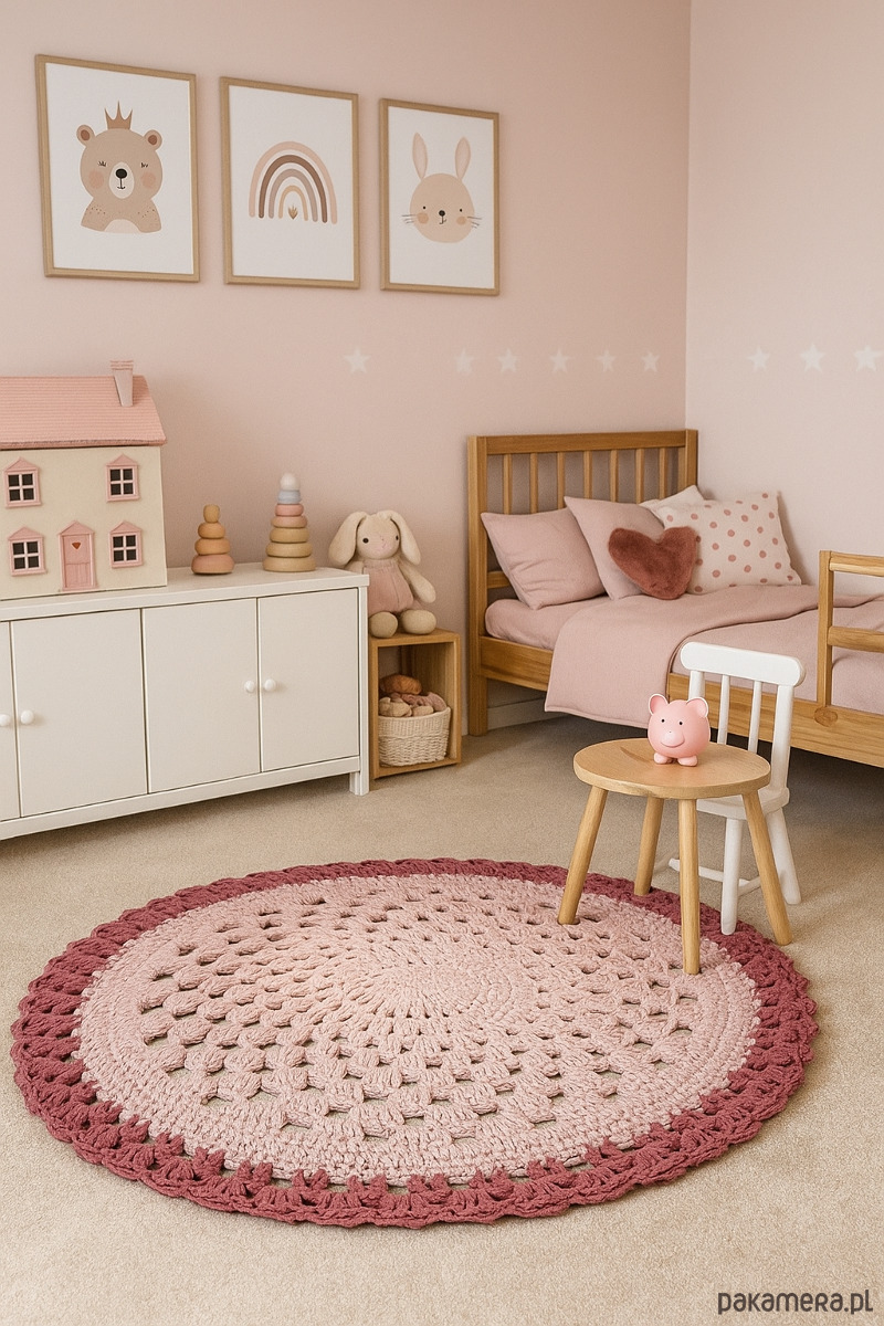 Dodaj ciepła i przytulności do swojego wnętrza dzięki wyjątkowemu, ręcznie wykonanemu dywanikowi szydełkowanemu ze sznurka bawełnianego. Idealny do pokoju dziecięcego, sypialni, salonu lub jako dekoracyjny akcent w przedpokoju.