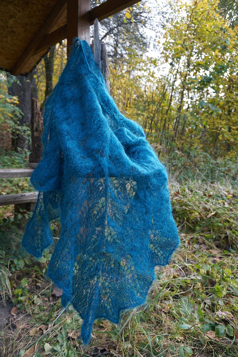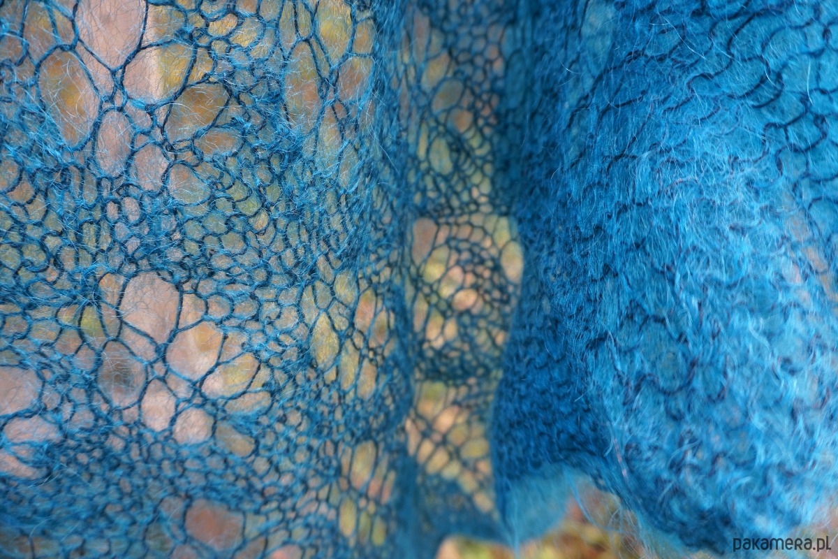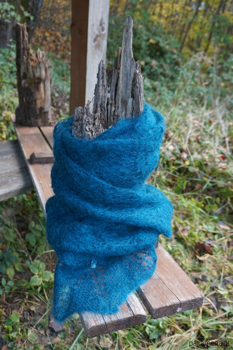 Puszysty, ciepły i eteryczny szal trójkątny wykonany ręcznie ze 100% moheru. Głęboki, morsko-turkusowy odcień oraz delikatna, ażurowa faktura sprawiają, że to wyjątkowy dodatek. Duży, miękki i otulający — idealny na chłodniejsze dni, a jednocześnie niezwykle lekki. Jedyny w swoim rodzaju.
