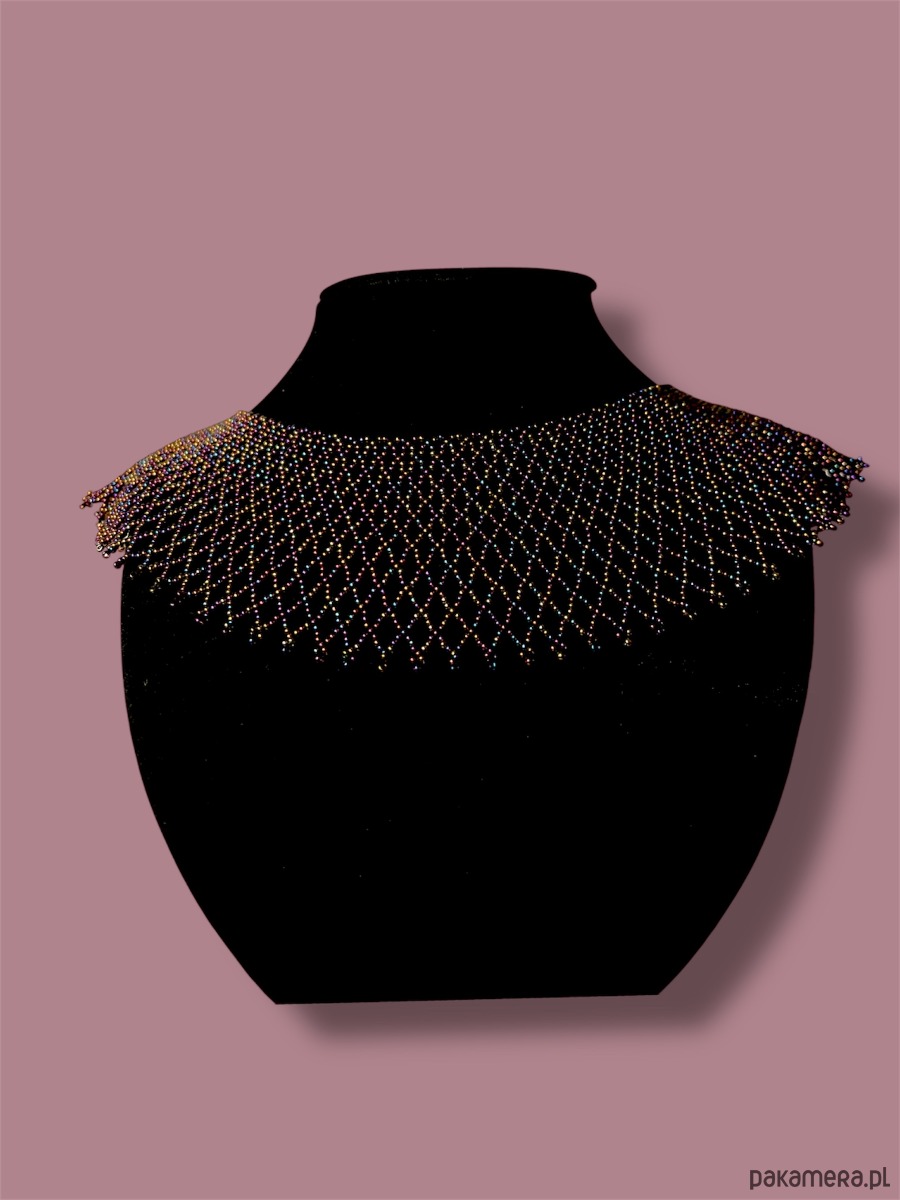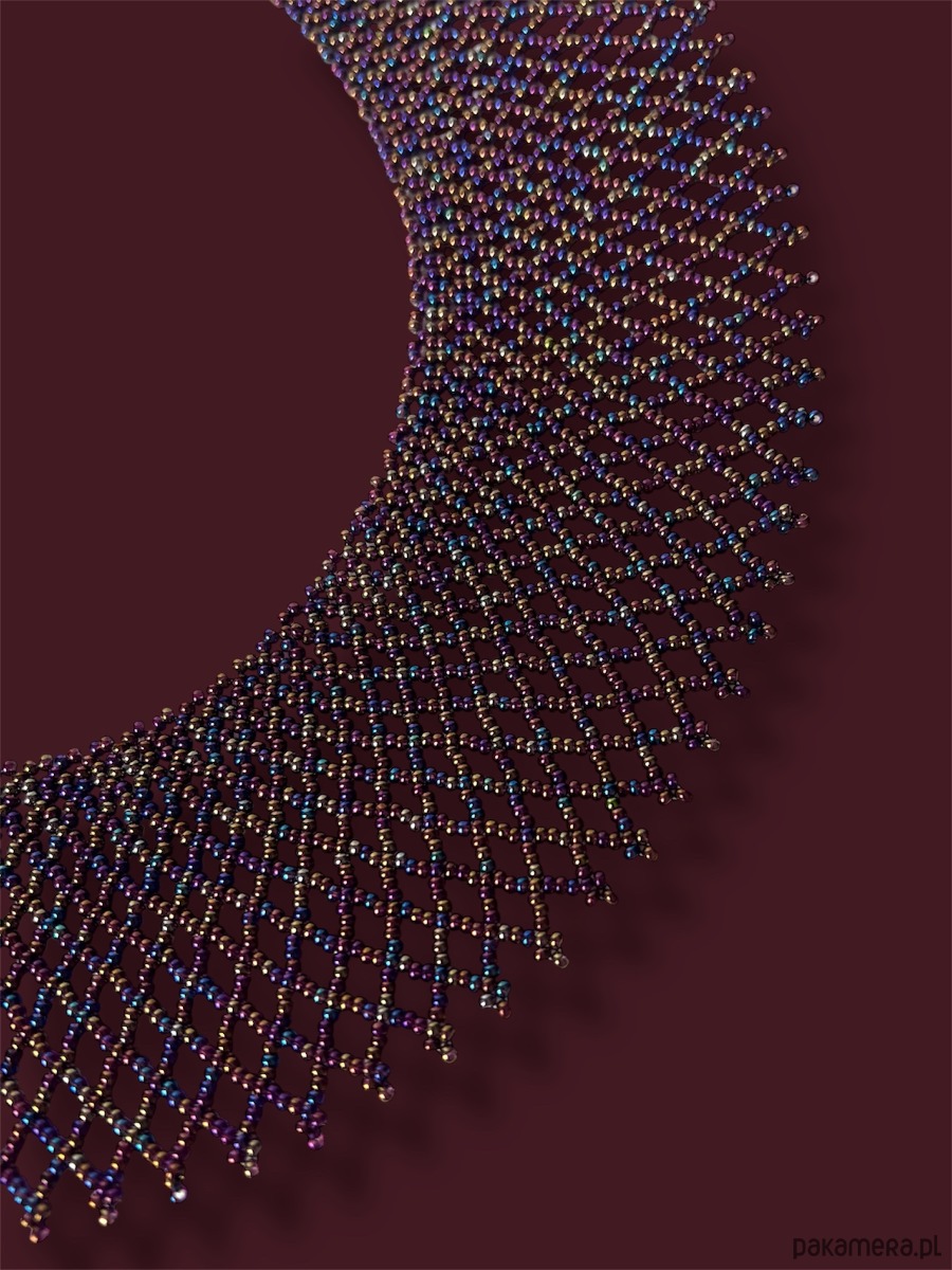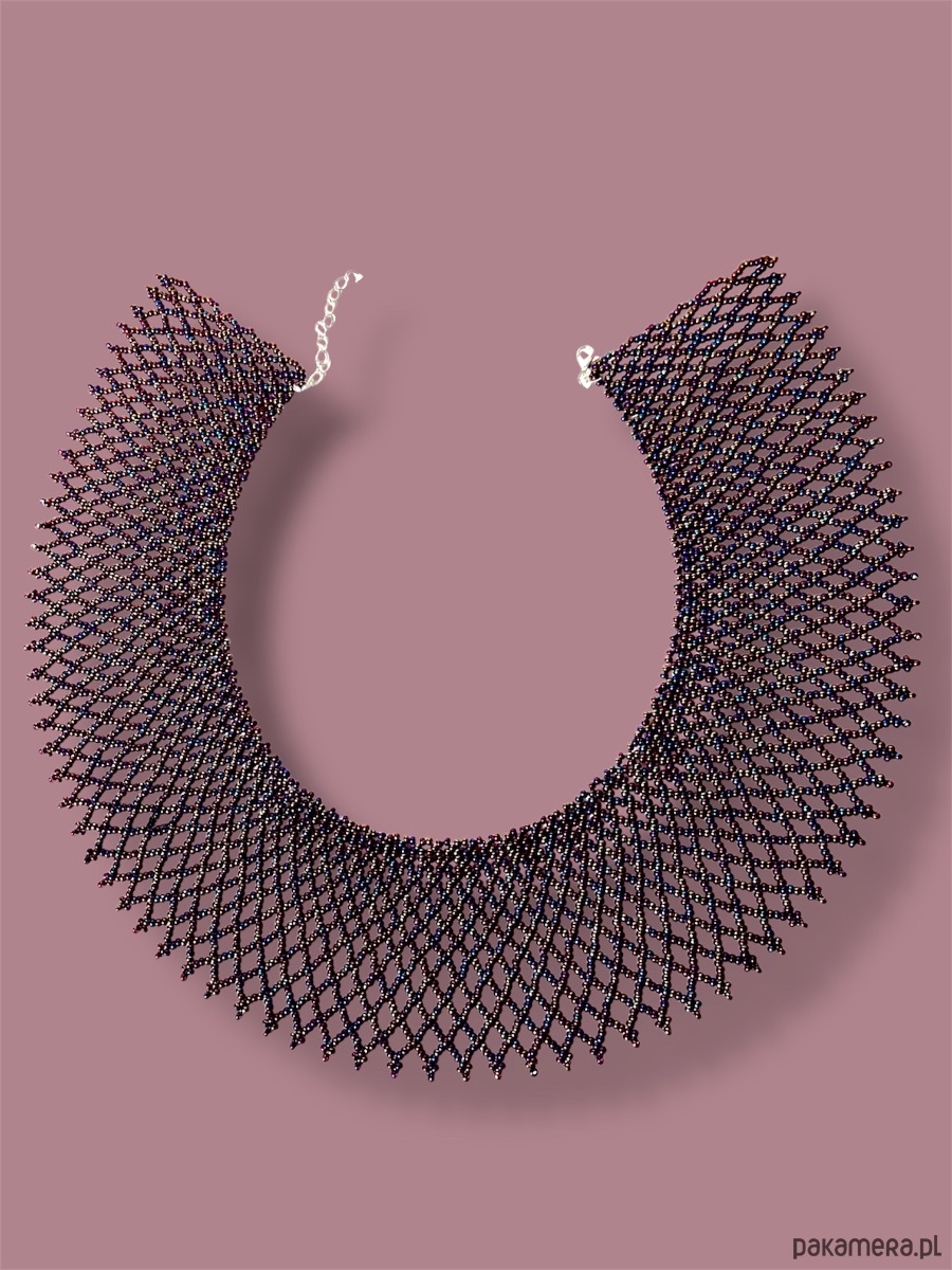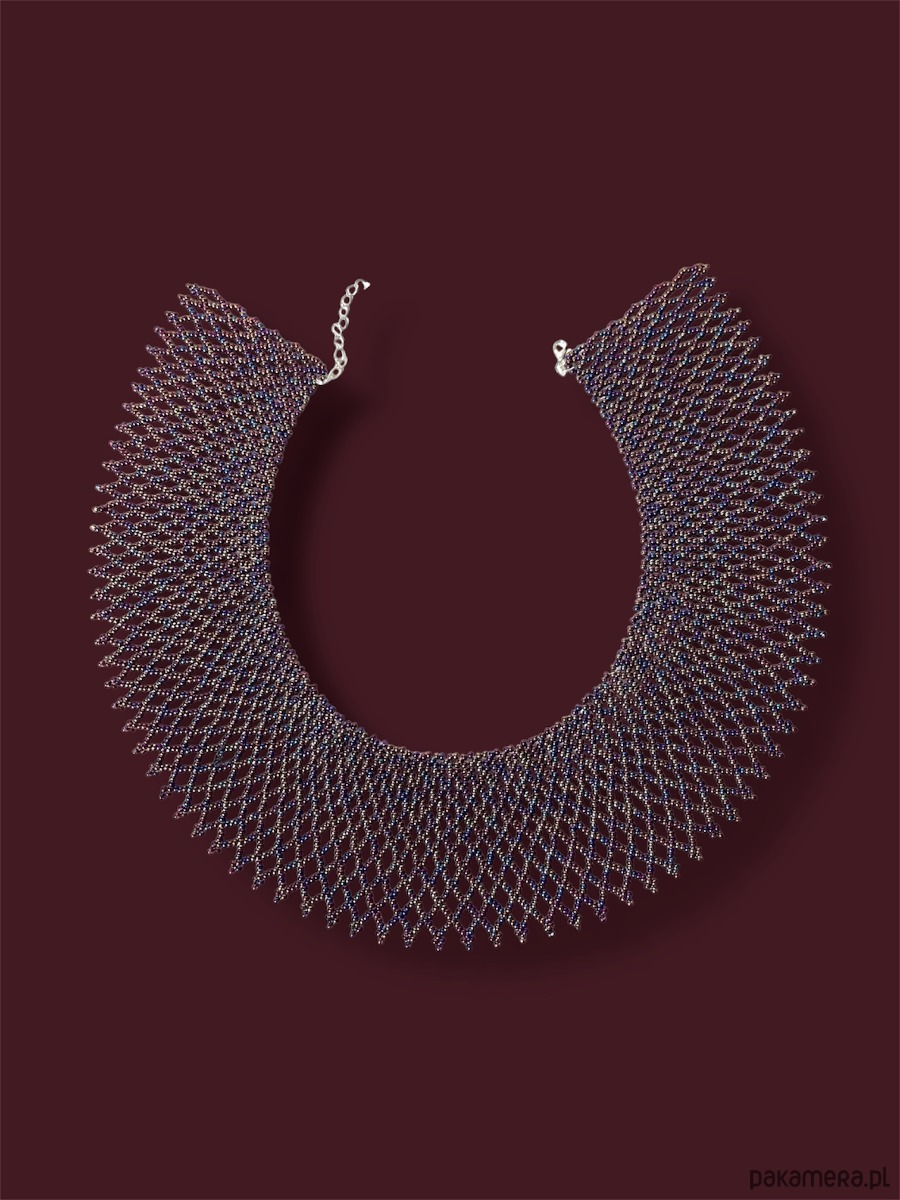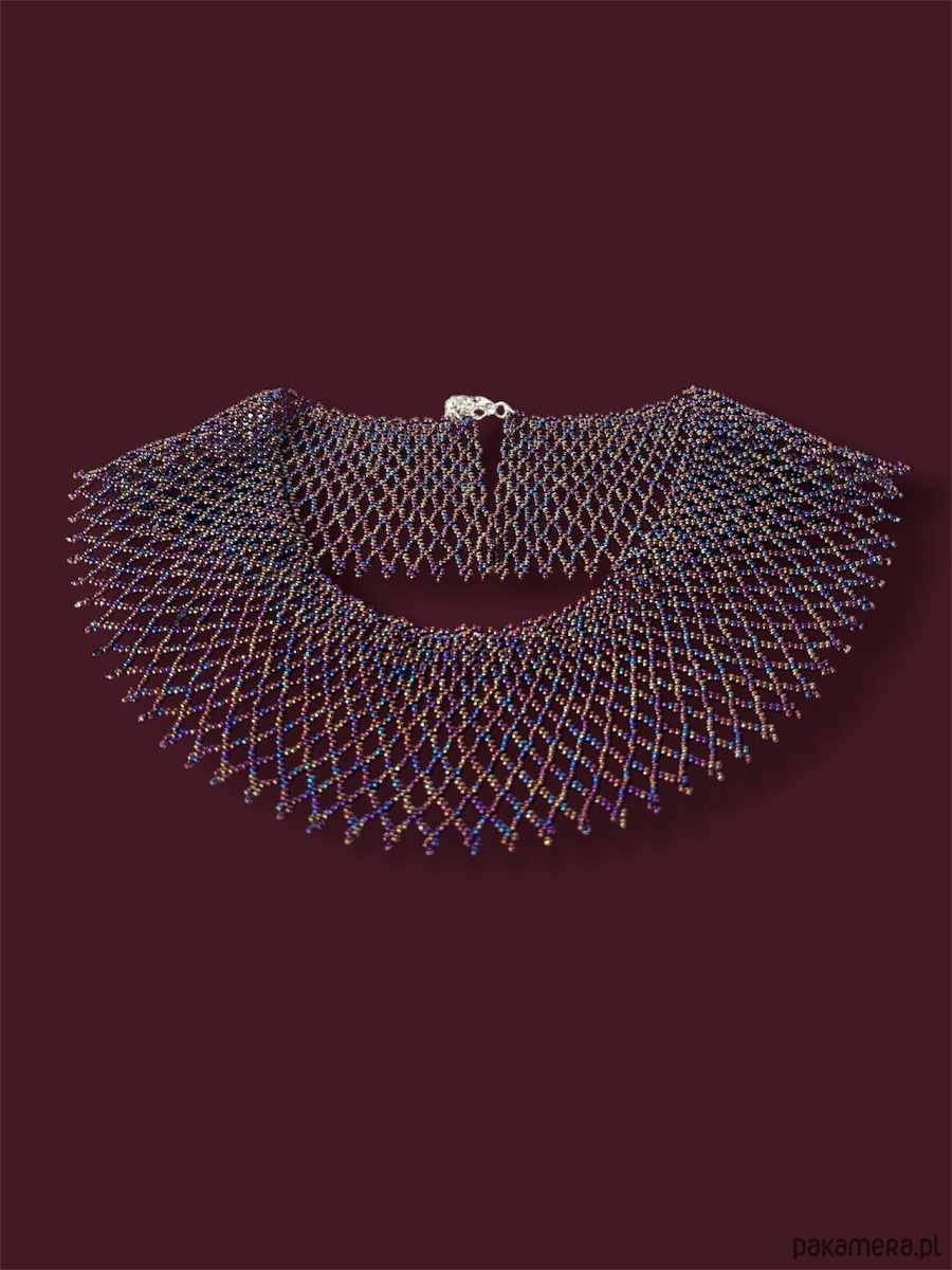 Efektowny ażurowy naszyjnik etno w formie kołnierza – łemkowska krywulka, inspirowany tradycyjną biżuterią karpacką. Szeroka forma pięknie otula szyję, a benzynowo-fioletowy kolor z delikatnym połyskiem zmienia się w zależności od światła, tworząc niezwykle szlachetny efekt.