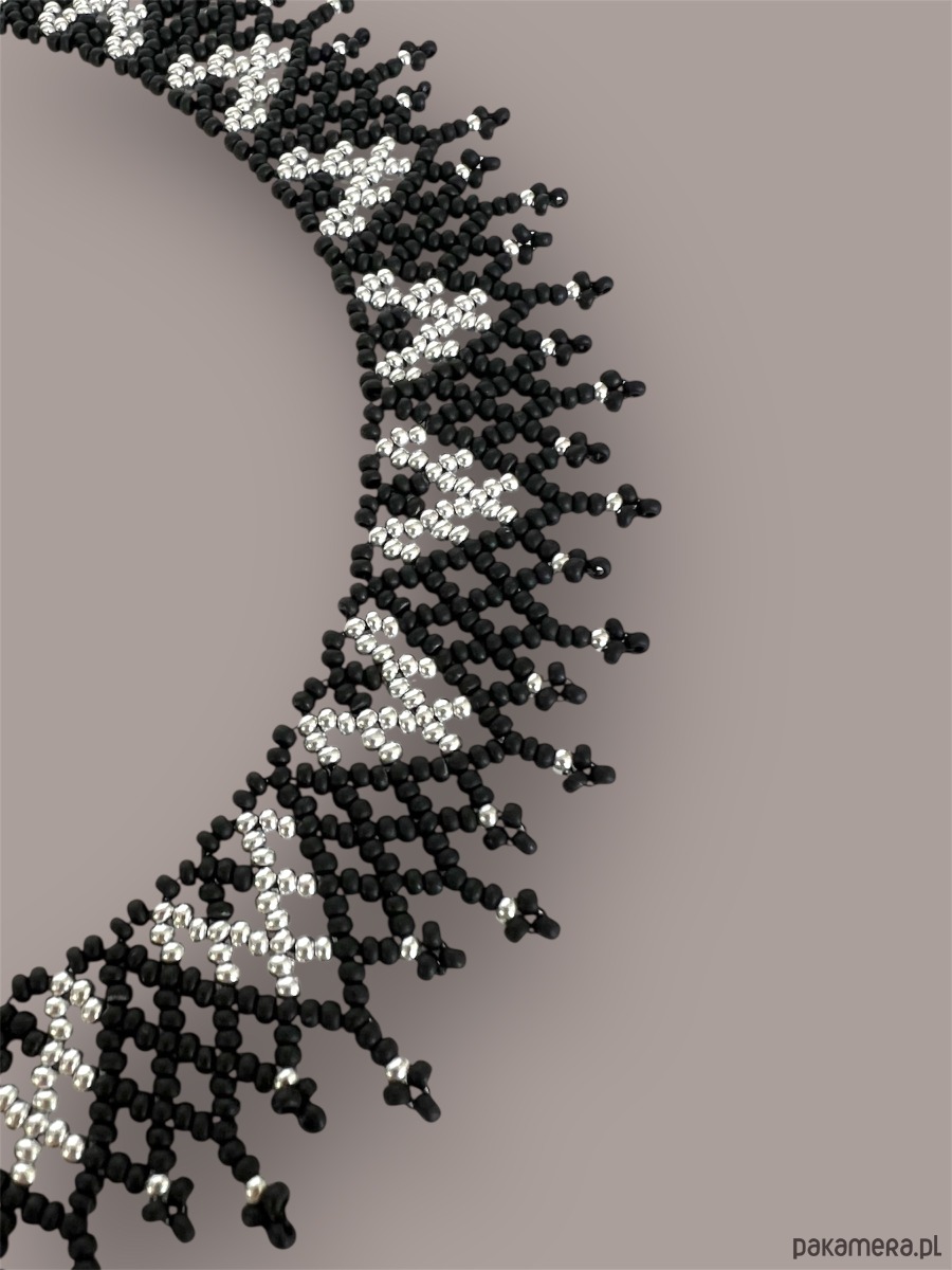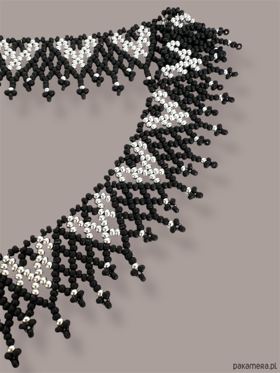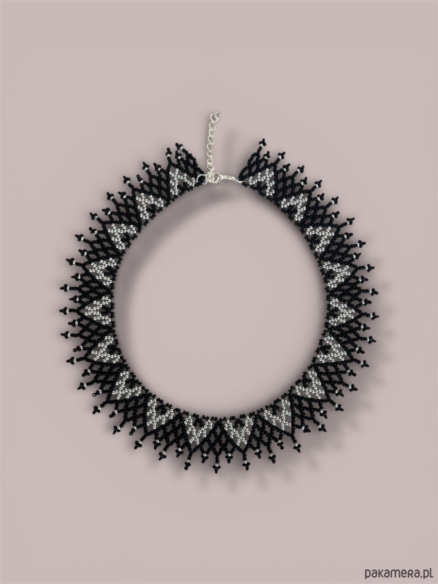 Elegancki, ażurowy naszyjnik etno typu krywulka łemkowska, wykonany ręcznie z wysokiej jakości czeskiego koralika. Subtelny srebrny ornament kontrastuje z matową czernią, tworząc bardzo estetyczne i ponadczasowe połączenie kolorów. Biżuteria inspirowana kulturą ludową Karpat – wyrazista, ale lekka w formie.