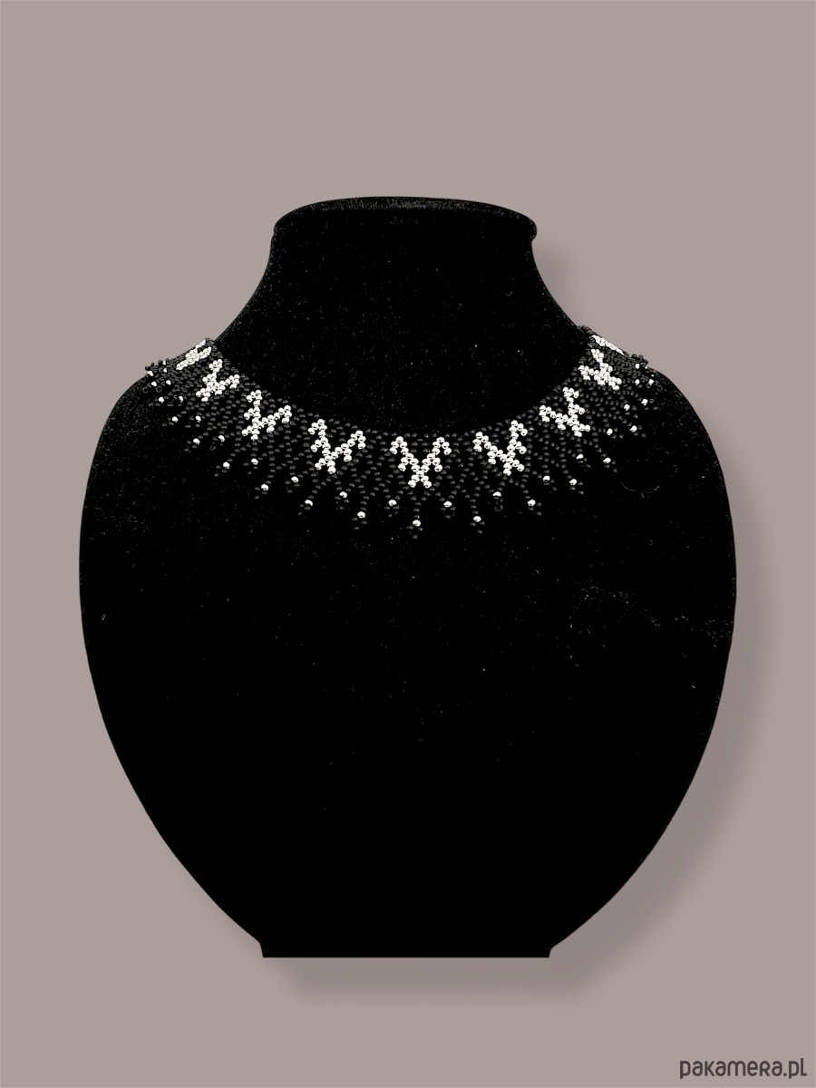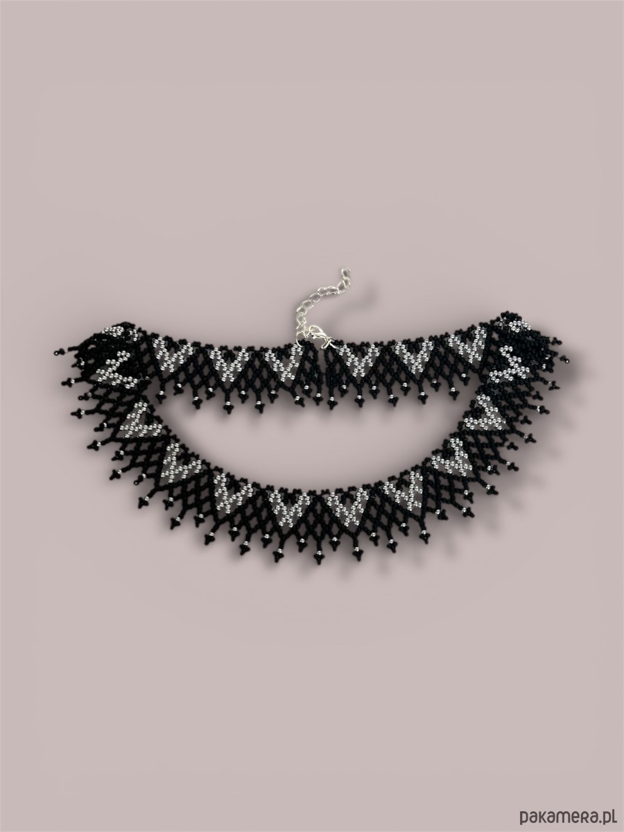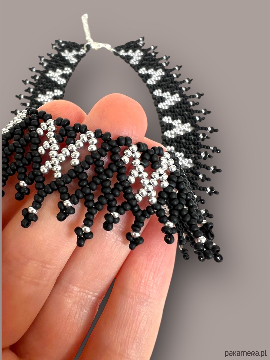 Elegancki, ażurowy naszyjnik etno typu krywulka łemkowska, wykonany ręcznie z wysokiej jakości czeskiego koralika. Subtelny srebrny ornament kontrastuje z matową czernią, tworząc bardzo estetyczne i ponadczasowe połączenie kolorów. Biżuteria inspirowana kulturą ludową Karpat – wyrazista, ale lekka w formie.