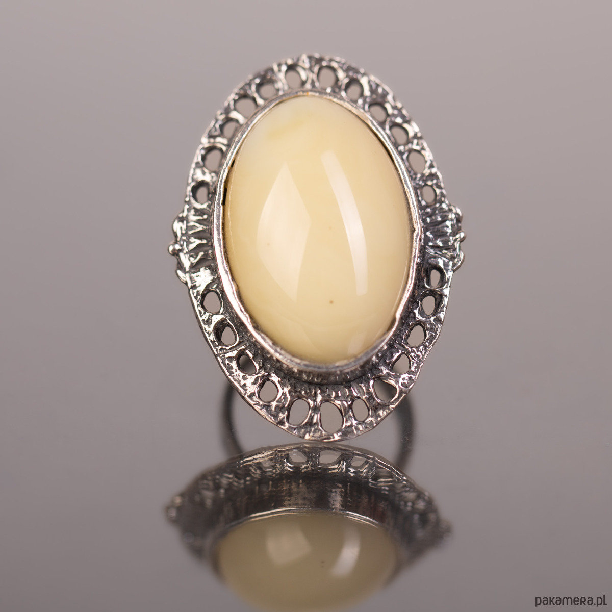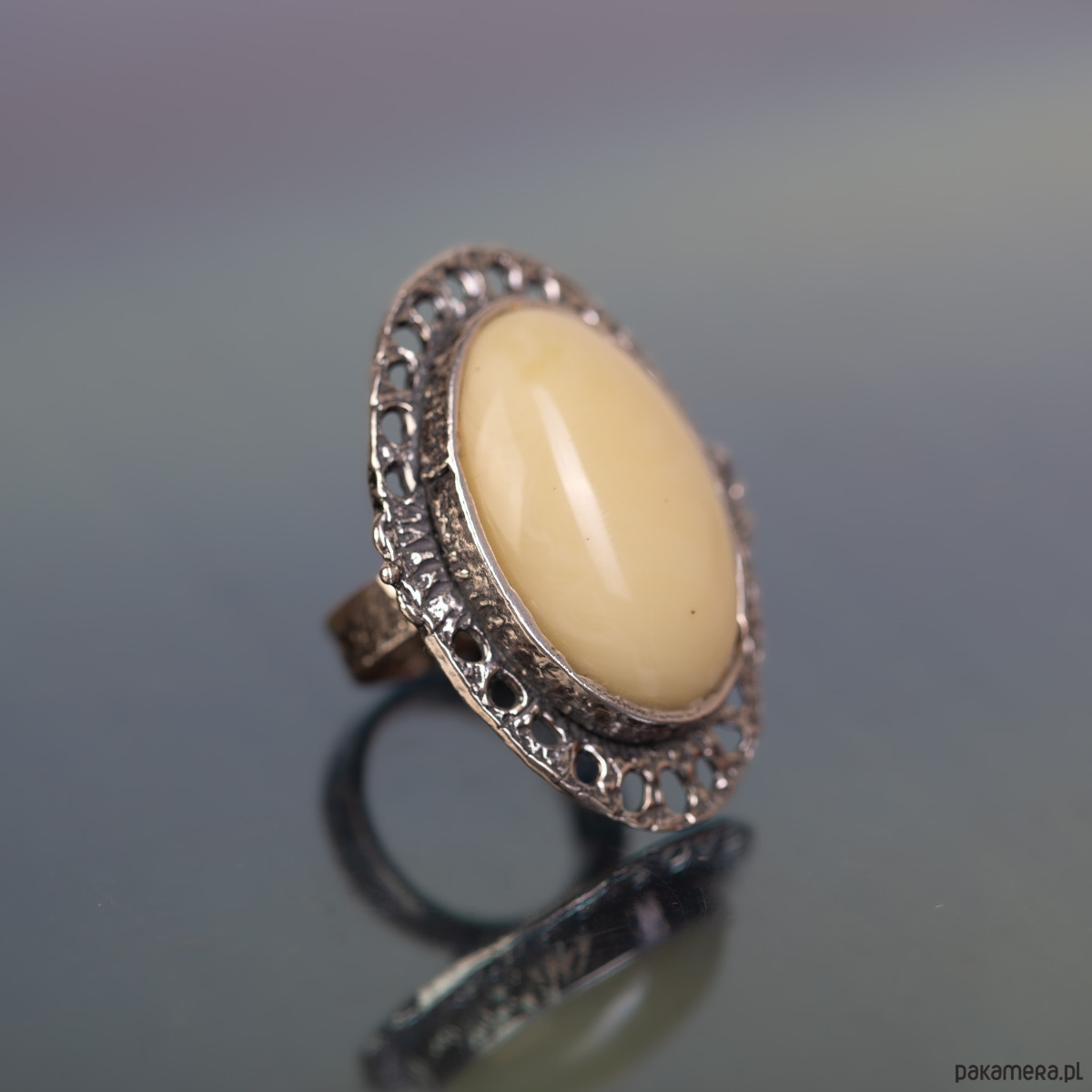 Elegancki pierścionek z naturalnym, mlecznym bursztynem bałtyckim o delikatnym, owalnym kształcie. Gładka, jasna bryła bursztynu ma miękki, subtelny blask. Ażurowa, ręcznie formowana srebrna oprawa o bogatym, dekoracyjnym wykończeniu tworzy wokół bursztynu delikatną ramę, podkreślając jego szlachetny charakter. To biżuteria o klasycznym, jednocześnie artystycznym charakterze.