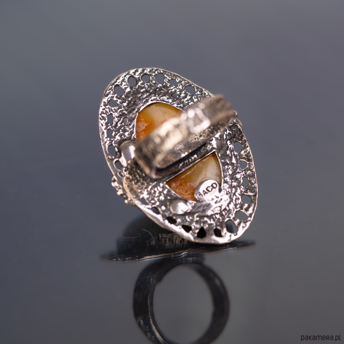 Ażurowy pierścionek z mlecznym bursztynem bałtyckim