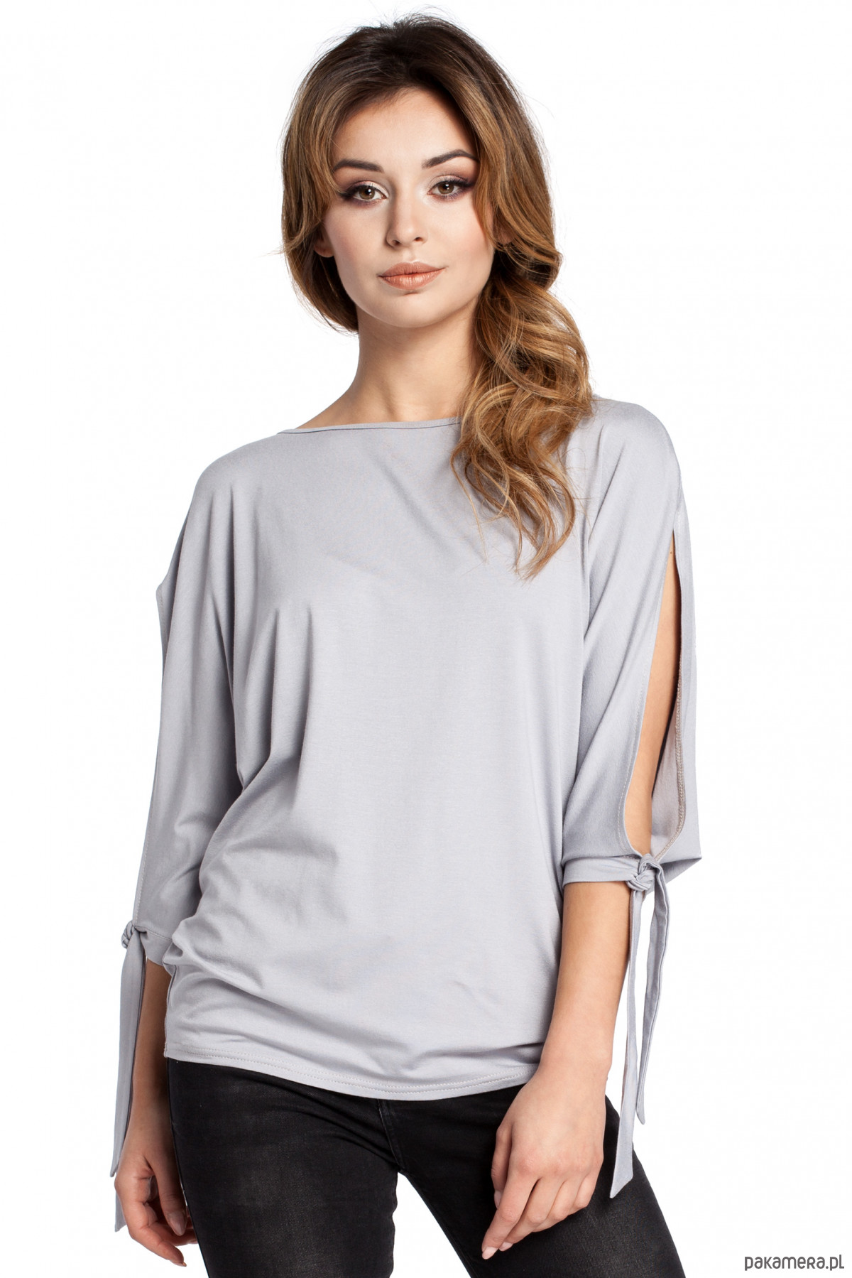 Niezwykle kobieca, luźna bluzka z rozciętymi rękawami z wiązaniem przy mankietach. Idealna do jeansów na co dzień jak i na okazję.