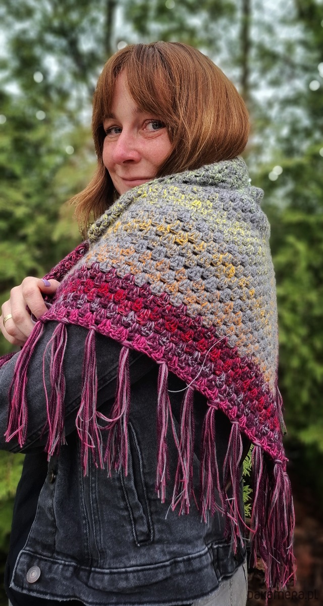 Kolorystyka: Subtelne przejścia od szarości i zieleni w centrum, przez ciepłe odcienie żółci i pomarańczy, aż po intensywne bordo i róż na brzegach. Idealna na jesień, zimę i chłodniejsze wiosenne dni.