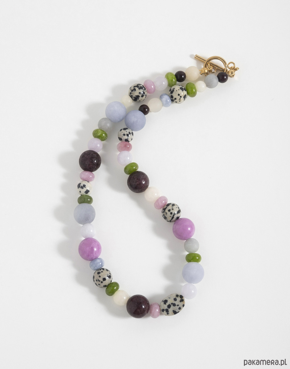 Naszyjnik w bordowo-błękitnej tonacji wykonano z naturalnych kamieni w różnych wielkościach: jaspisu dalmatyńskiego, agatu, jadeitu.