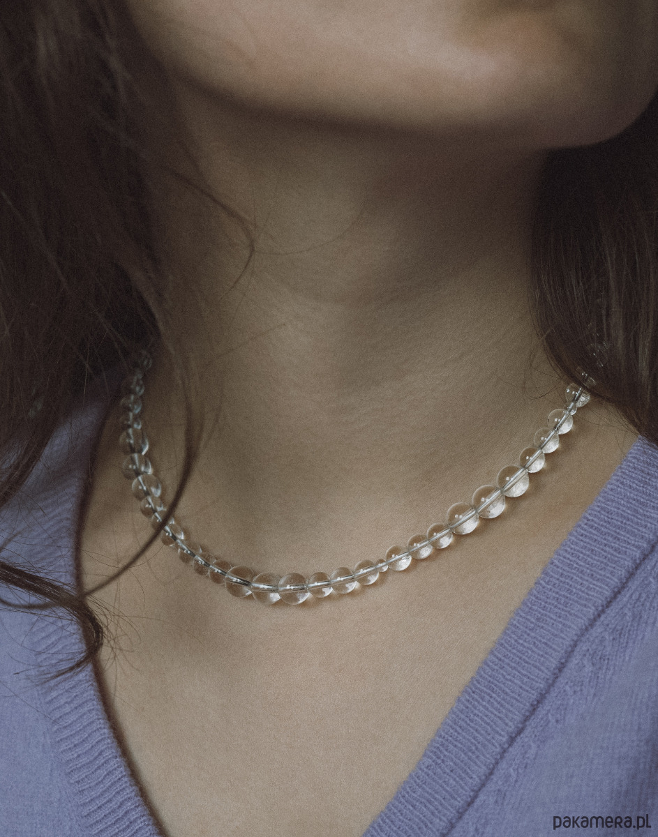 Ręcznie wykonany naszyjnik z kryształu górskiego, składający się z gładkich, przezroczystych kulek o różnej wielkości, które tworzą delikatny, bąbelkowy efekt. Kryształ górski skrywa niezwykłą moc – potrafi odpychać negatywną energię, a tę, którą absorbuje, przemienia w pozytywną. Dzięki temu nazywany jest „królem kryształów” lub „neutralizatorem.”