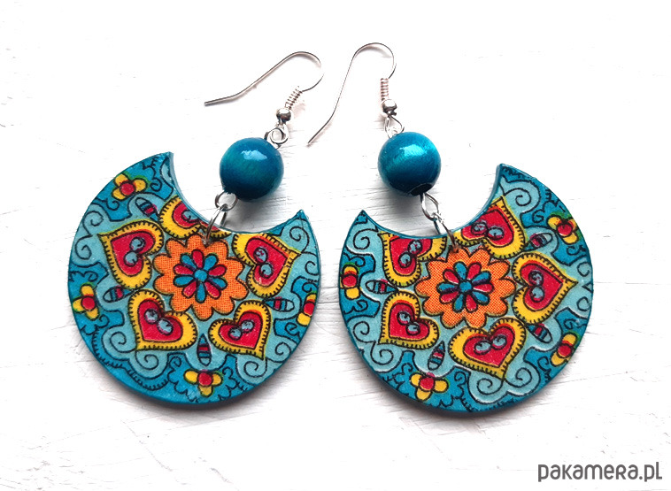 kolczyki drewniane, ozdobione metodą decoupage, dwustronne, starannie wykończone farbami akrylowymi i zabezpieczone wielokrotnie lakierem, koraliki drewniane, bigle posrebrzane, długość kolczyków bez bigli: 5 cm, średnica: 4 cm, bardzo lekkie