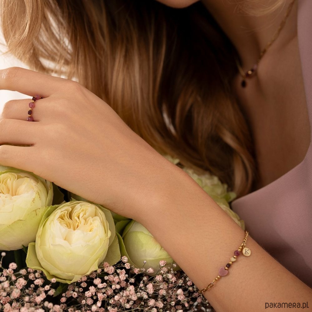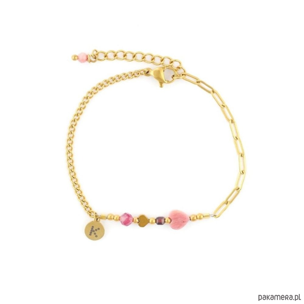 Bransoletka wykonana została z wysokiej jakości pozłacanej antyalergicznej stali szlachetnej, która się nie wyciera i nie zmienia koloru podczas użytkowania. Wymiary:Kamienie: Kostka Granatu/ Turmalin Różowy/HematytWielkość kamieni: 2,5mm/4mm/2mmWielkość serca z Hematytu: 4mmWielkość serca Rodonitu: 6mm Grubość splotu pancerki: ok. 2mm x 1mm Grubość łańcucha: 3mm x 6,5 mm x 0,5mm Blaszka z logo: ok. 6mmMateriał: antyalergiczna stal chirurgiczna Rozmiar uniwersalny z możliwością regulacji za pomocą przedłużki.