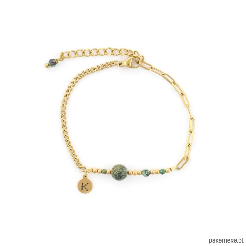 Bransoletka wykonana jest z antyalergicznej stali szlachetnej pozłacanej, która nie uczula. Bez obaw, pozłocenie pięknie się utrzymuje, nie ciemnieje i nie wyciera. Wymiary:Kamienie: Hematyt/Turkus AfrykańskiWielkość kamieni: 2mm/2mm,3mm,4mm,6mmGrubość splotu pancerki: ok. 2mm x 1mm Grubość łańcucha: 3mm x 6,5 mm x 0,5mm Długość bransoletki: standardowa ok 17,5cmBlaszka z logo: ok. 6mm Materiał: antyalergiczna stal chirurgiczna Rozmiar uniwersalny z możliwością regulacji za pomocą przedłużki.