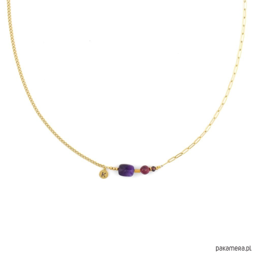 Ten pozłacany naszyjnik wykonałyśmy z dwóch łańcuchów o różnych splotach i kamieni naturalnych: Hematyt, Ametyst, Agat Rubinowy oraz Granat.Granat to kamień kreatywności. Jest to kamień tworzenia i rozpoczynania czegoś nowego. Wpływa na wiarę w siebie i dążenie do celów. Hematyt to kamień wojowników. Silnie oczyszcza krew. Budzi radość do życia, dodaje odwagi i wiary we własne umiejętności. Ametyst to kamień regeneracji. Przywraca równowagę osobom podatnym na stres, uwalnia umysł od negatywnych myśli. Pomaga przy łagodzeniu konfliktów w życiu osobistym i zawodowym. Oczyszcza miejsca z negatywnej energii. Agat to kamień równowagi. Harmonizuje sferę fizyczną, emocjonalną i intelektualną. Działa uspokajająco, dodaje pewności siebie. Naszyjnik wykonany jest z antyalergicznej stali szlachetnej pozłacanej, która nie uczula. Bez obaw, pozłocenie pięknie się utrzymuje, nie ciemnieje i nie wyciera.