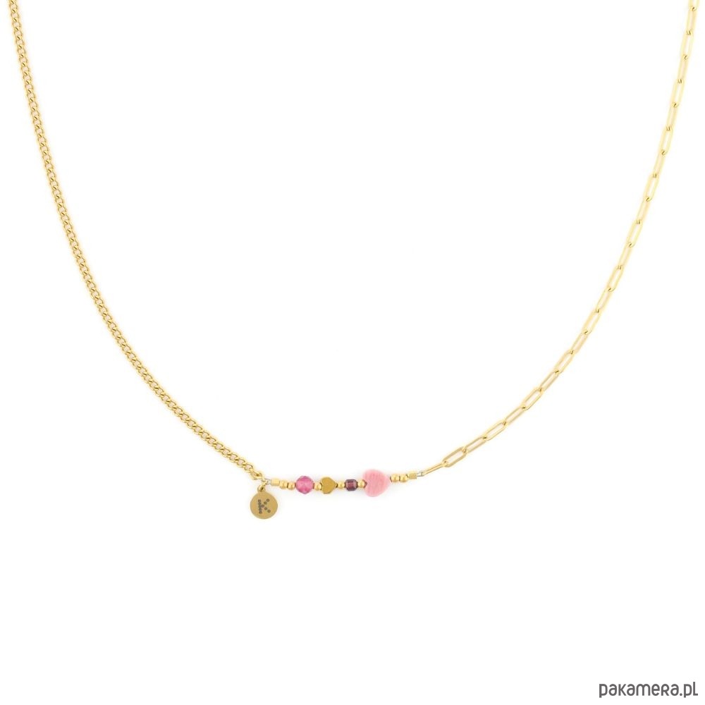 Ten pozłacany naszyjnik wykonałyśmy z dwóch łańcuchów o różnych splotach i kostki Granatu, Różowego Turmalinu, mini serca Hematytu oraz serca Rodonitu.