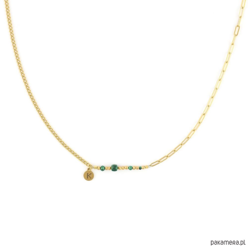 Ten pozłacany naszyjnik wykonałyśmy z dwóch łańcuchów o różnych splotach, a jego sercem są kamienie Hematyt i Malachit, które doskonale współgrają z energią Byka.