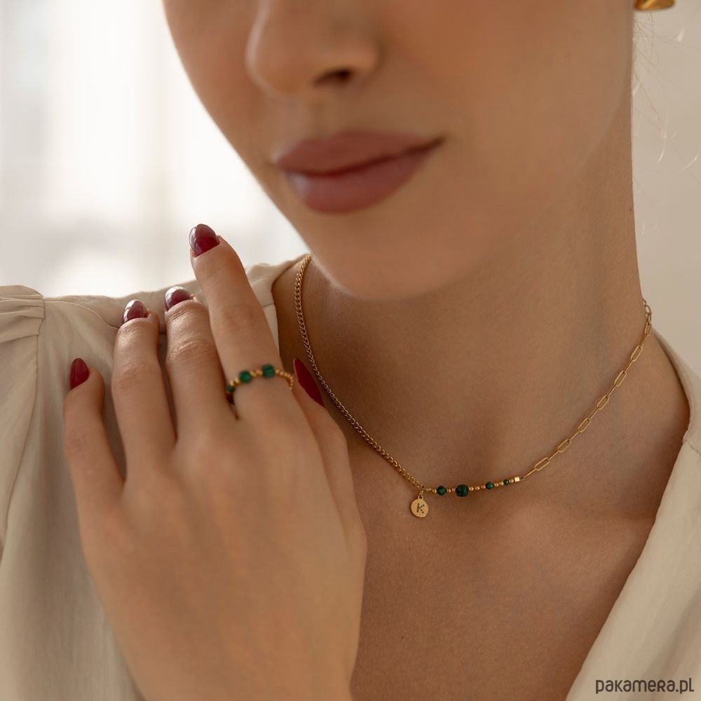 Ten pozłacany naszyjnik wykonałyśmy z dwóch łańcuchów o różnych splotach, a jego sercem są kamienie Hematyt i Malachit, które doskonale współgrają z energią Byka.
