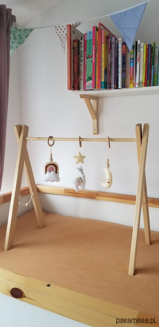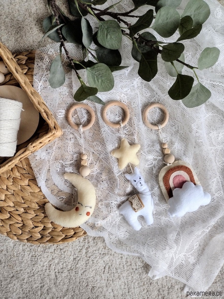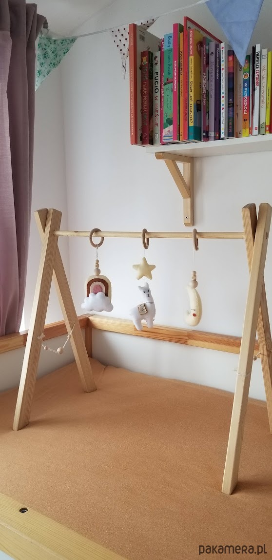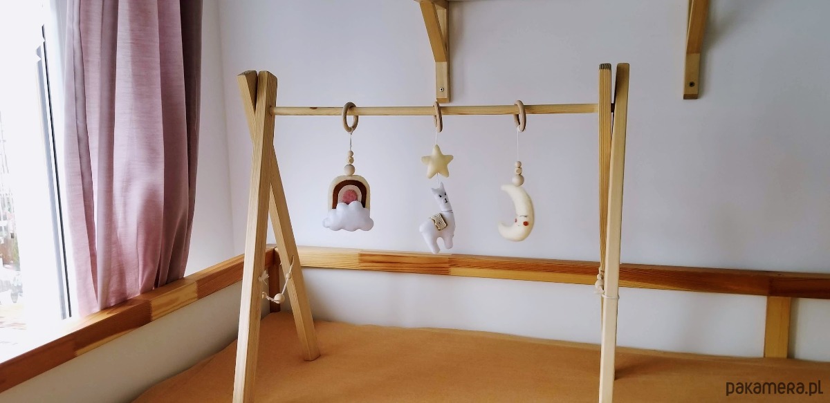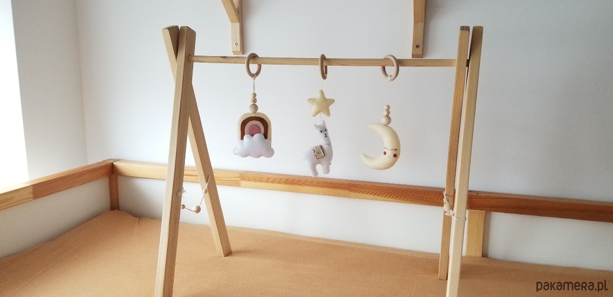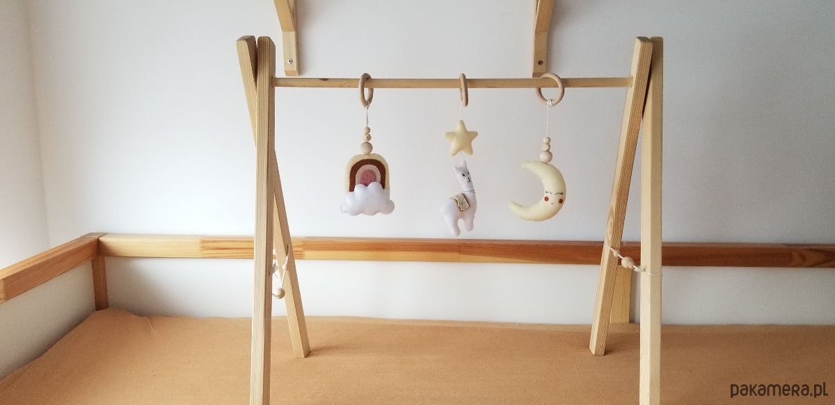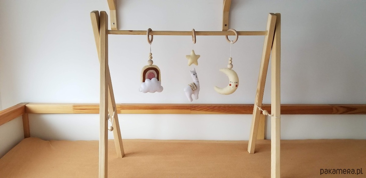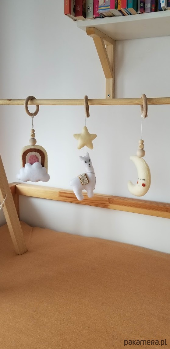 Piękny i drewniany stojak edukacyjny Baby Gym wykonany i sprzedawany wraz z kompletem 3x (trzech ) filcowych zawieszek w kontrastowych kolorach przedstawiające ksieżyc, chmurkę z tęcza oraz lamę/alpakę.