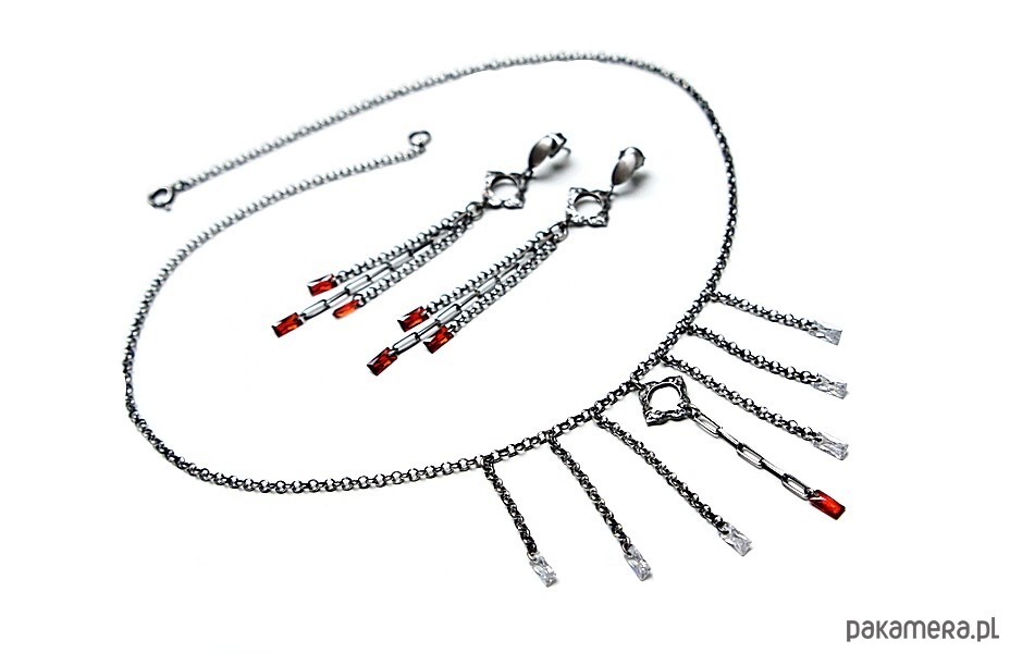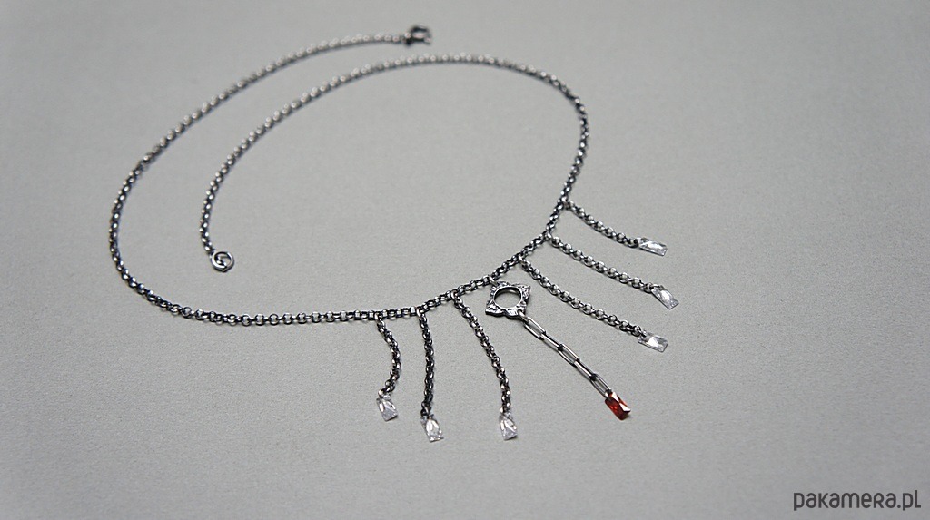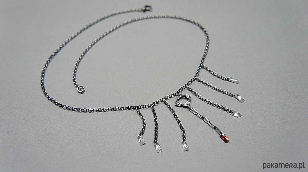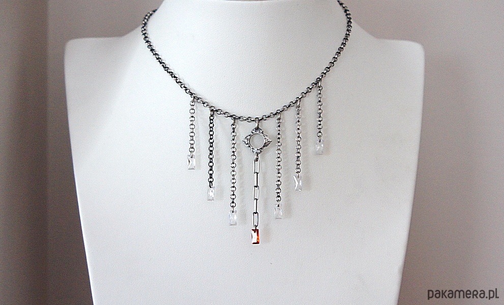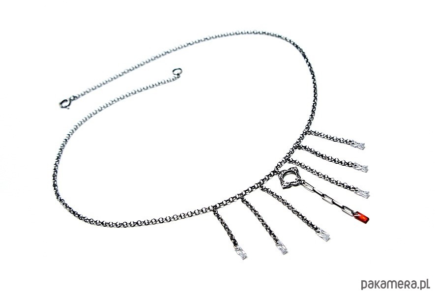 Naszyjnik wykonany ze srebra [pr. 925] w połączeniu z cyrkoniami w kształcie bagietek. Srebro oksydowane i przetarte. Całkowita długość naszyjnika około 44,5cm . Biżuteria ozdobnie zapakowana.