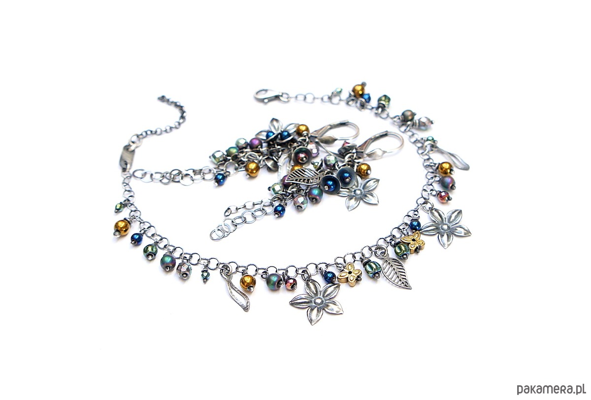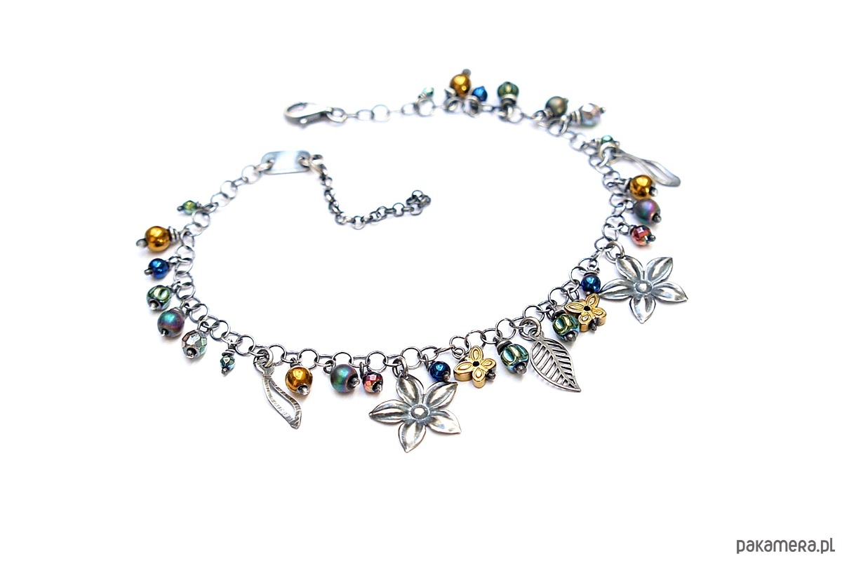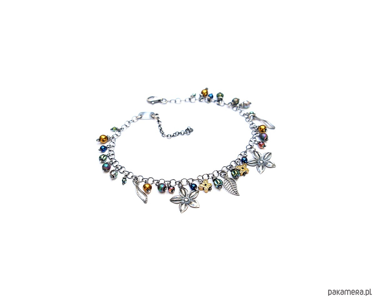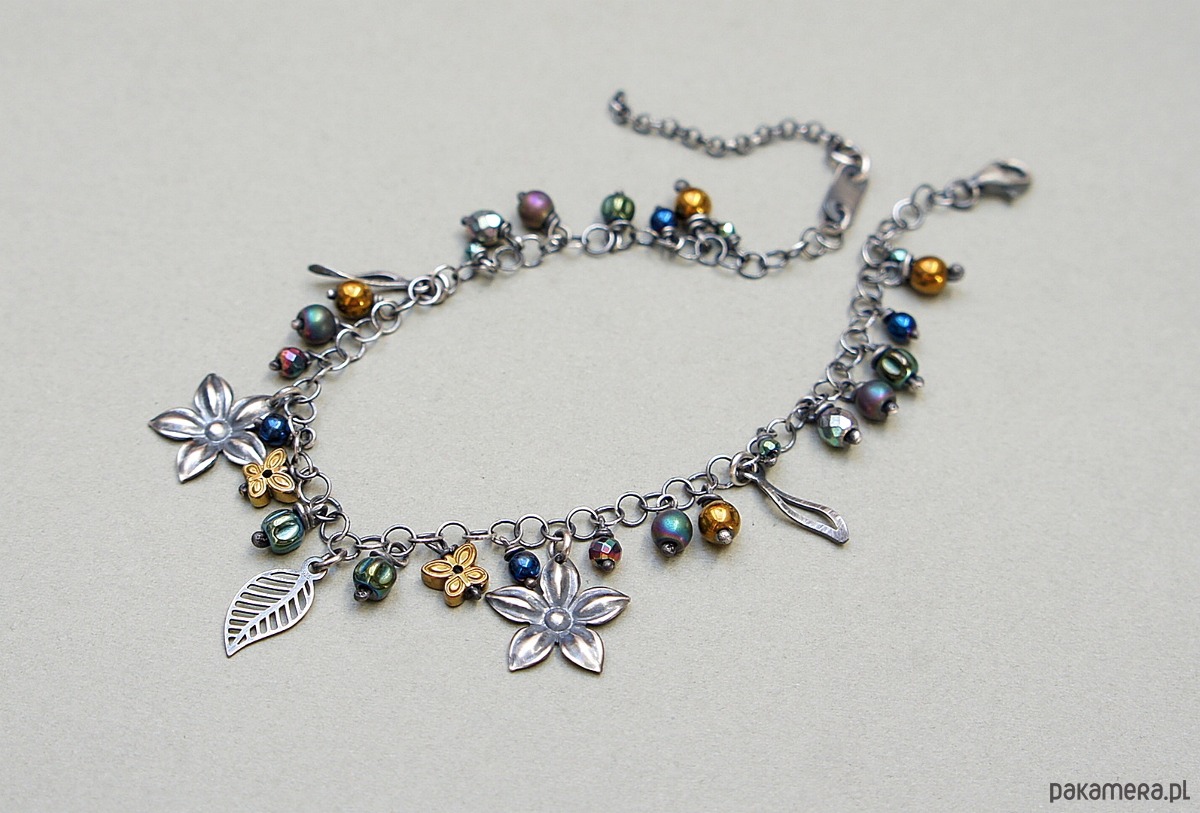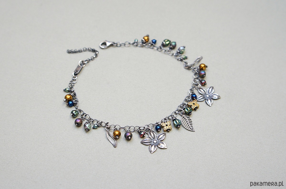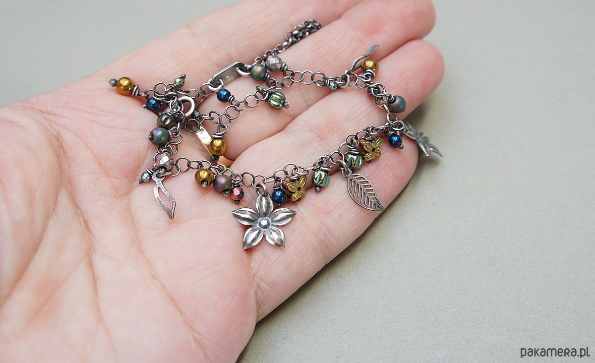 Bransoletka  wykonana ze srebra [pr. 925] w połączeniu z kuleczkami wielokolorowych hematytów [4mm,3mm i 2mm], hematytowymi motylkami oraz srebrnymi zawieszkami. Całość oksydowana i przetarta. Całkowita długość bransoletki 20,5cm plus ozdobna przedłużka. Biżuteria ozdobnie zapakowana. Do kompletu można dokupić kolczyki przedstawione na zdjęciu.