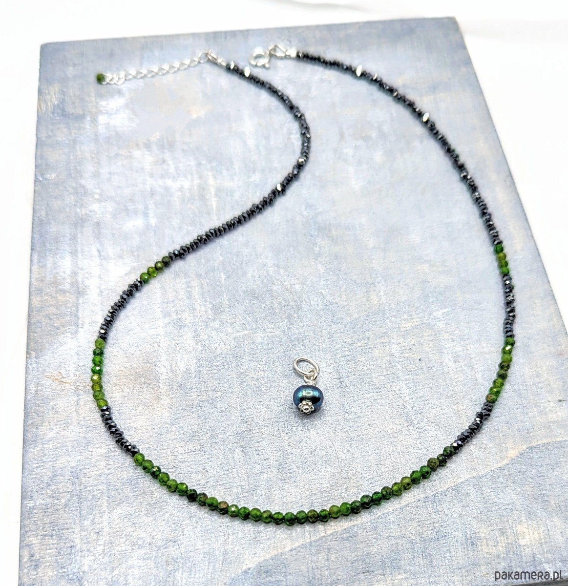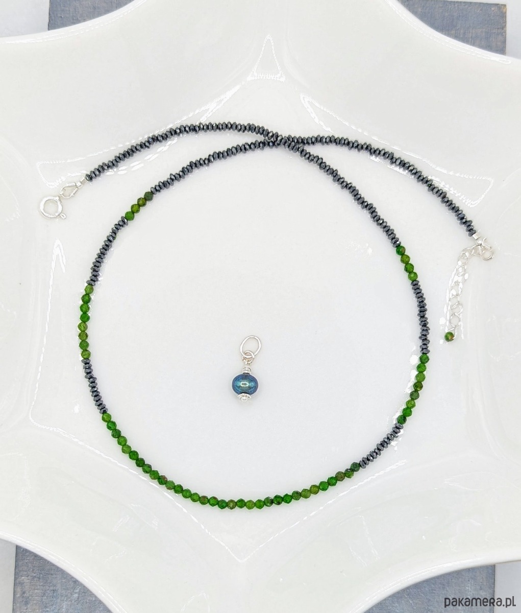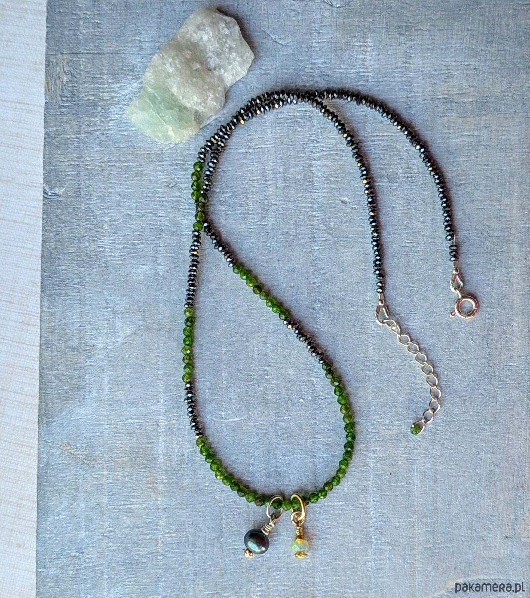 Delikatny naszyjnik wykonany z fasetowanych kamieni diopsydu i hematytu. Diopsyd ma intensywną zieloną barwę i ładnie komponuje się z hematytem galwanizowanym na odcień ciemny stalowy. Dzięki precyzyjnemu szlifowaniu kamienie migoczą , a naszyjnik jest rozświetlony. W komplecie znajdują się dwie zawieszki: z benzynową perłą w srebrnym wykończeniu oraz z opalem etiopskim w pozłacanym srebrze. Zawieszki można zdejmować.