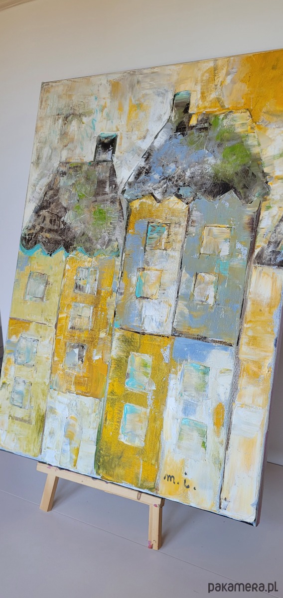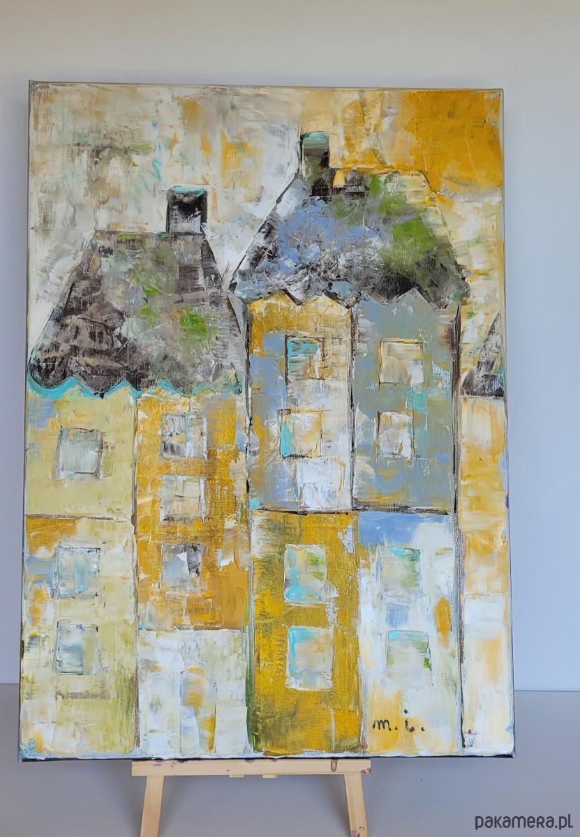 Ręcznie malowany obraz olejny na płótnie, wykonany w technice szpachli. Kompozycja przedstawia domy ukazane w powiększonej perspektywie, co nadaje im nieco nierealny, bajkowy charakter. Obraz utrzymany jest w ciepłej palecie żółci i brązów, przełamanej akcentami turkusu — tworząc harmonijny, a zarazem dynamiczny kontrast kolorystyczny.