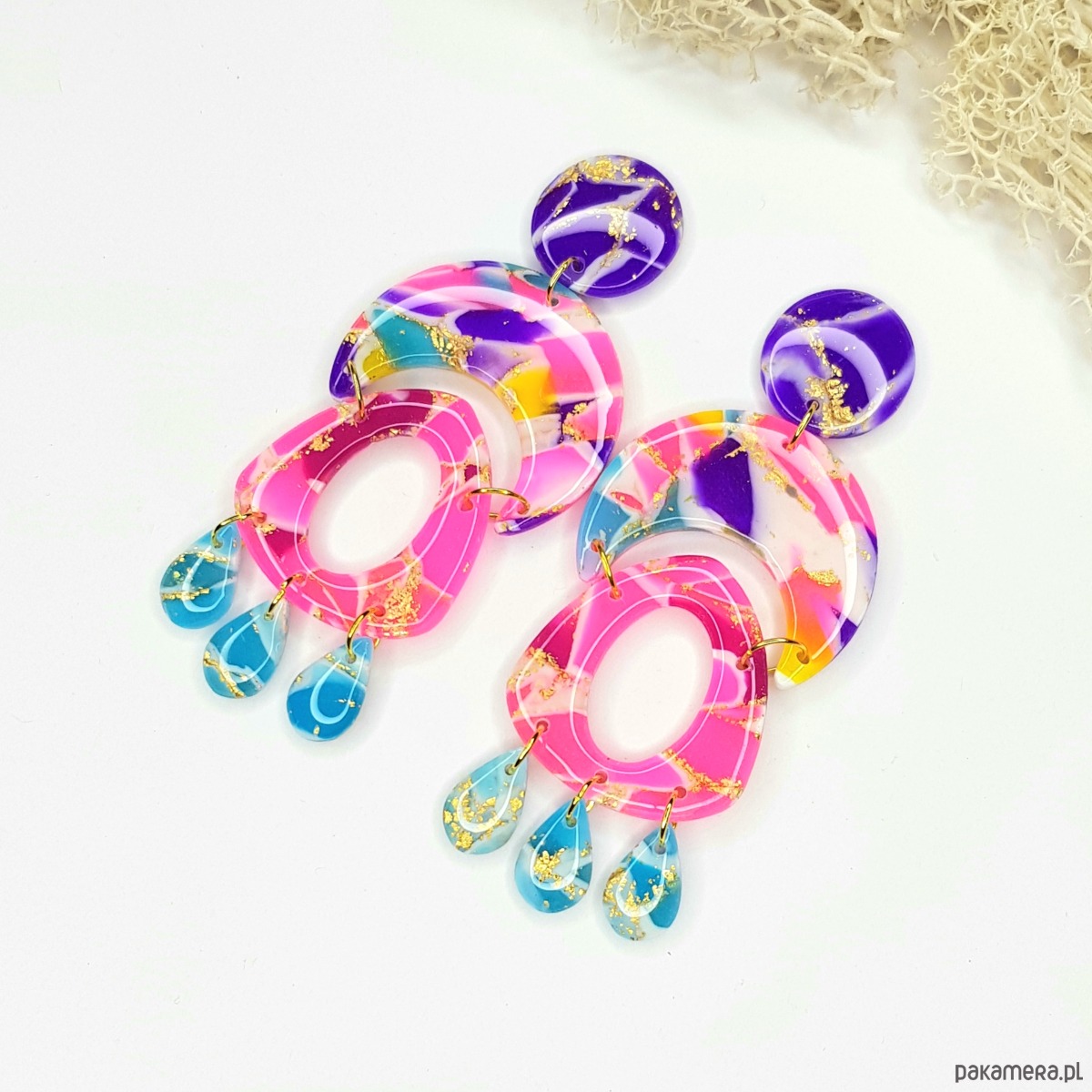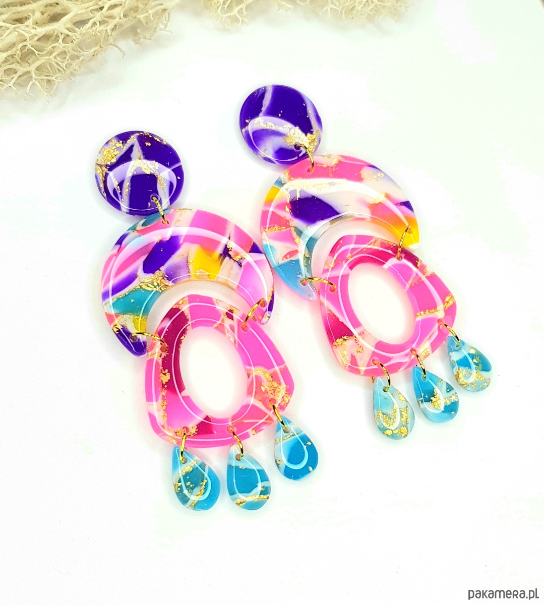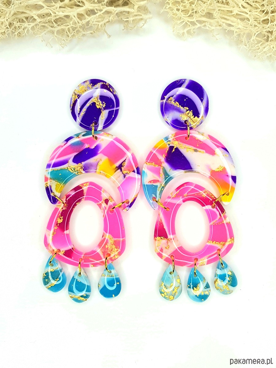 Przepiękne i żywe kolczyki wylepione z artystycznej glinki polimerowej z dodatkami płatków złota.