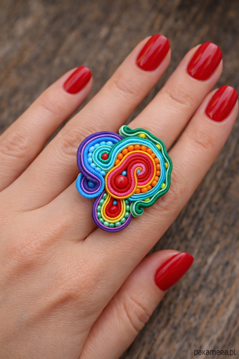 Pierścionek wykonany w technice haftu soutache – kolorowy, oryginalny i pełen energii.