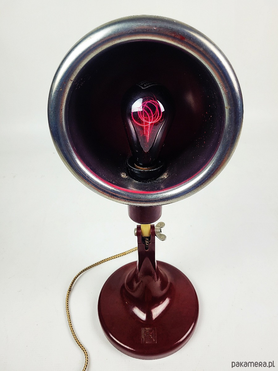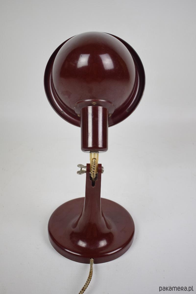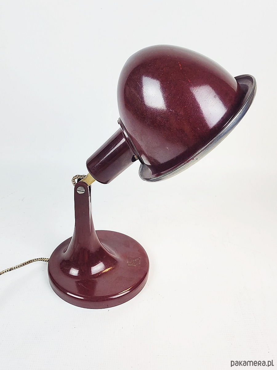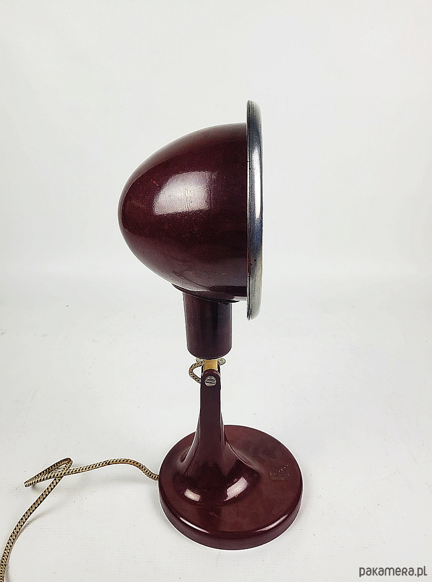 Lampa pochodzi z 1968 roku. Jest to rzadki model w kolorze czerwono-bordowym z bakelitu, wyprodukowana w Niemczech, pierwotnie była medyczną lampą grzewczą, posiada żarówkę termiczną. Stan lampy : dobry, posiada minimalne ślady czasu w postaci delikatnych rys.