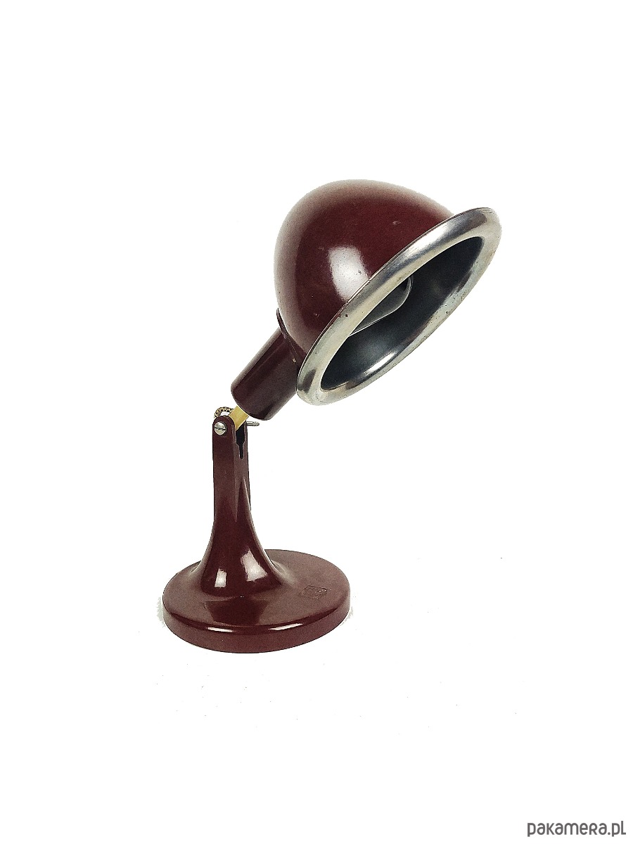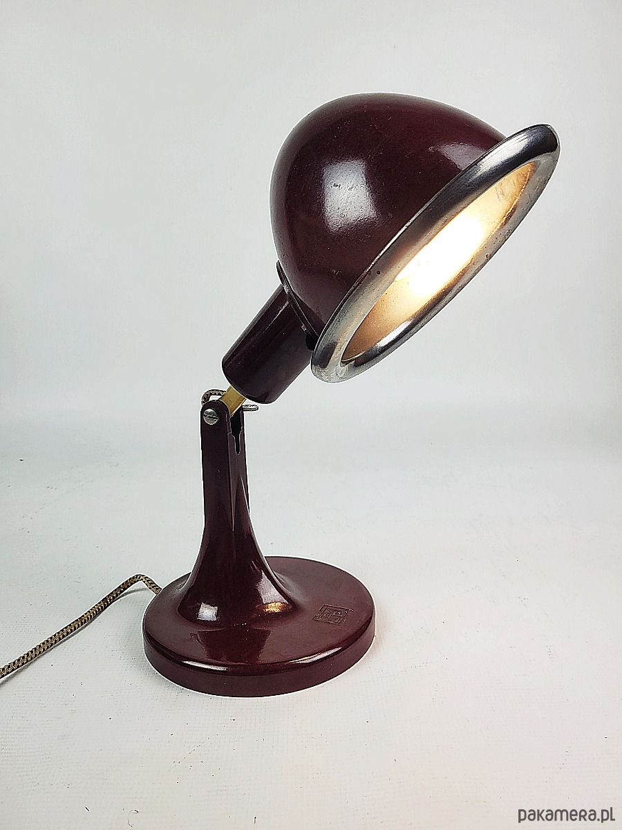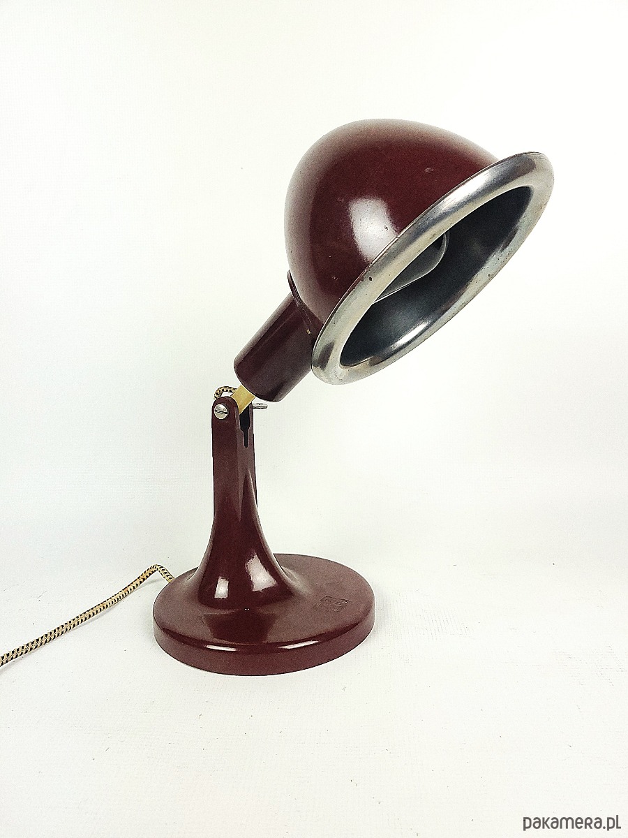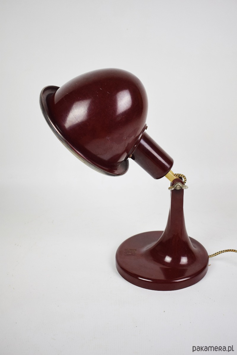 Lampa pochodzi z 1968 roku. Jest to rzadki model w kolorze czerwono-bordowym z bakelitu, wyprodukowana w Niemczech, pierwotnie była medyczną lampą grzewczą, posiada żarówkę termiczną. Stan lampy : dobry, posiada minimalne ślady czasu w postaci delikatnych rys.