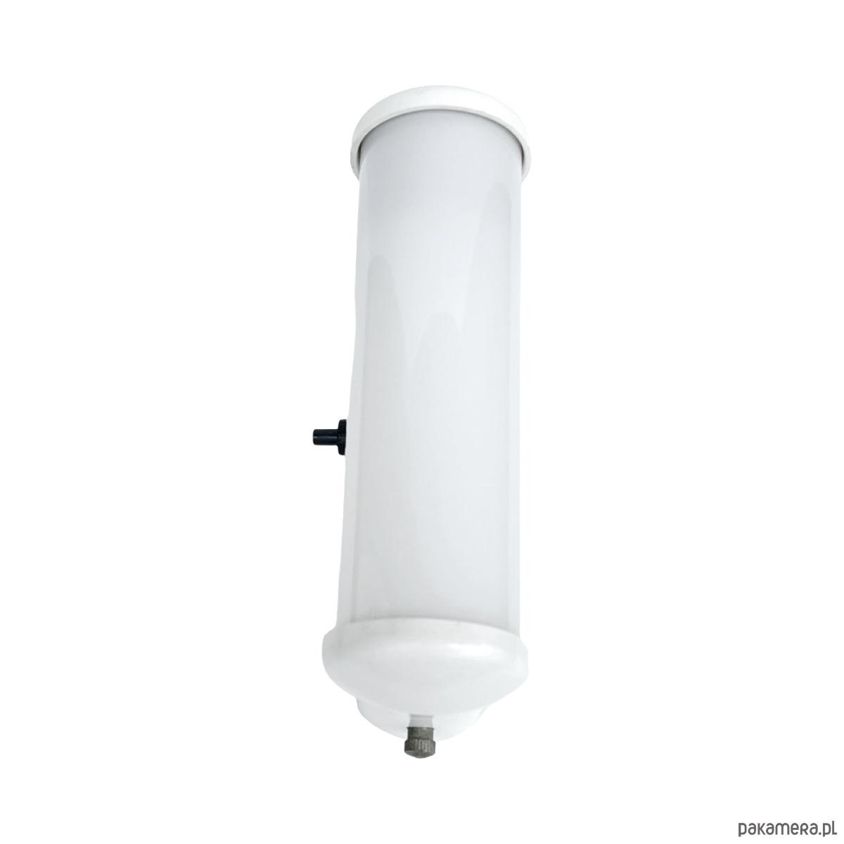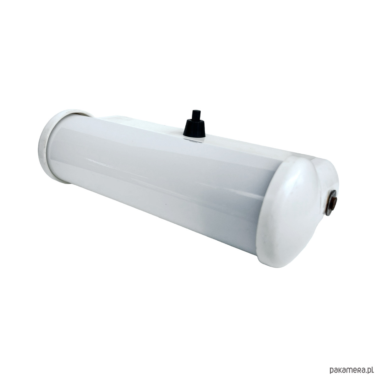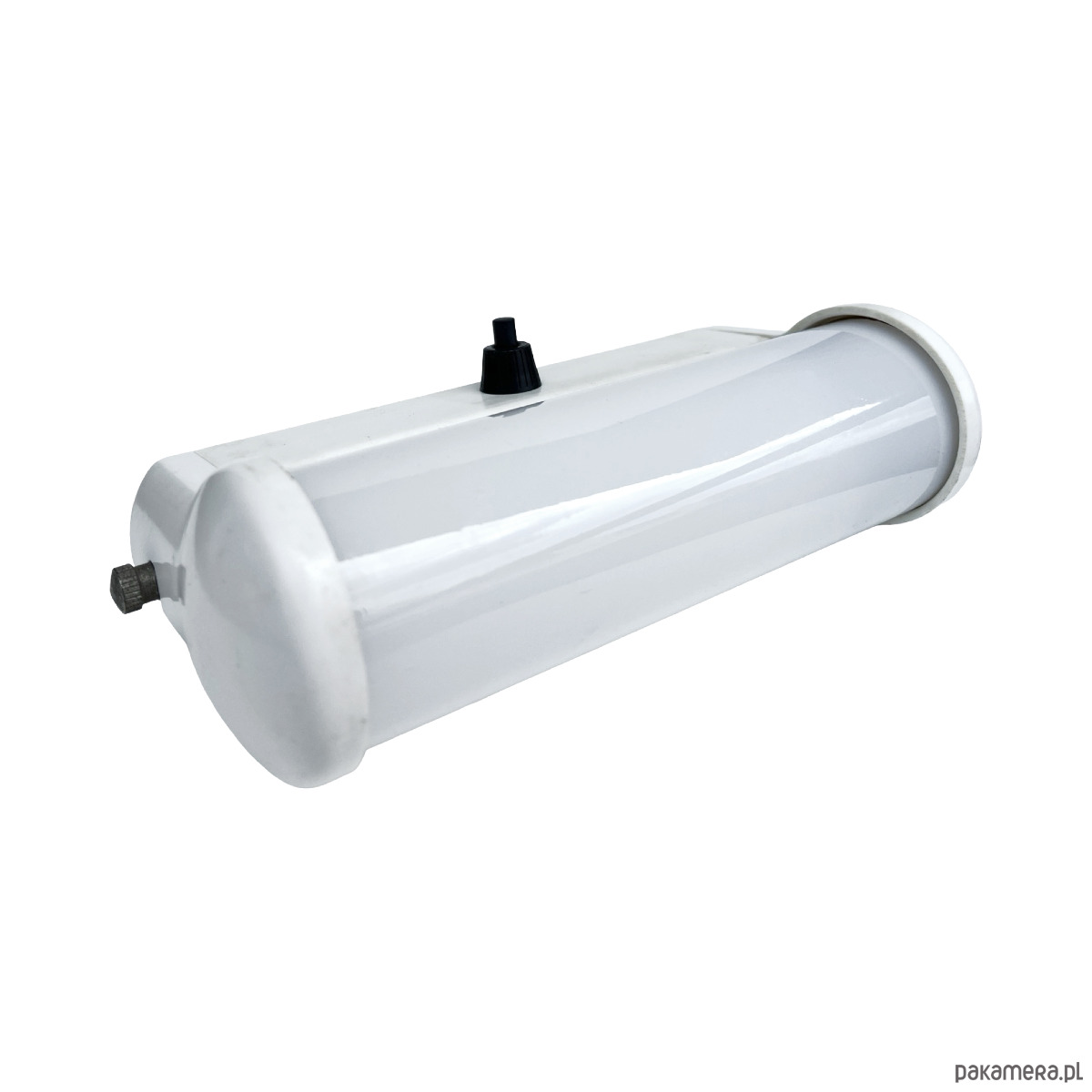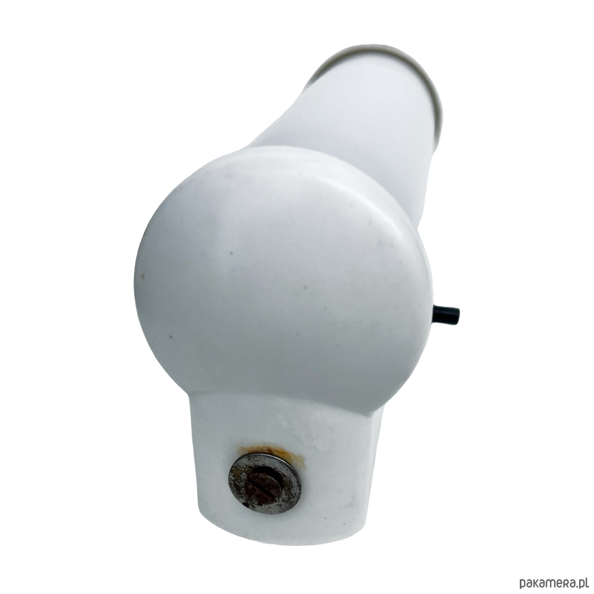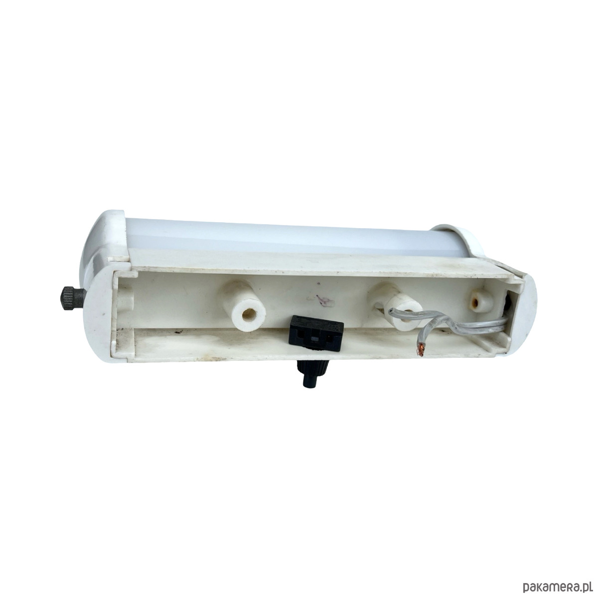 Klasyczny, modernistyczny kinkiet bakelitowy ze szklanym, tubowym kloszem wyprodukowany w Czechosłowacji w połowie ubiegłego wieku. Lampa sprawna w stanie oryginalnym dobrym, nosi ślady użytkowania. Uszkodzenie podstawy widoczne na zdjęciach. Lampa na pojedynczą żarówkę E14 do 40W.