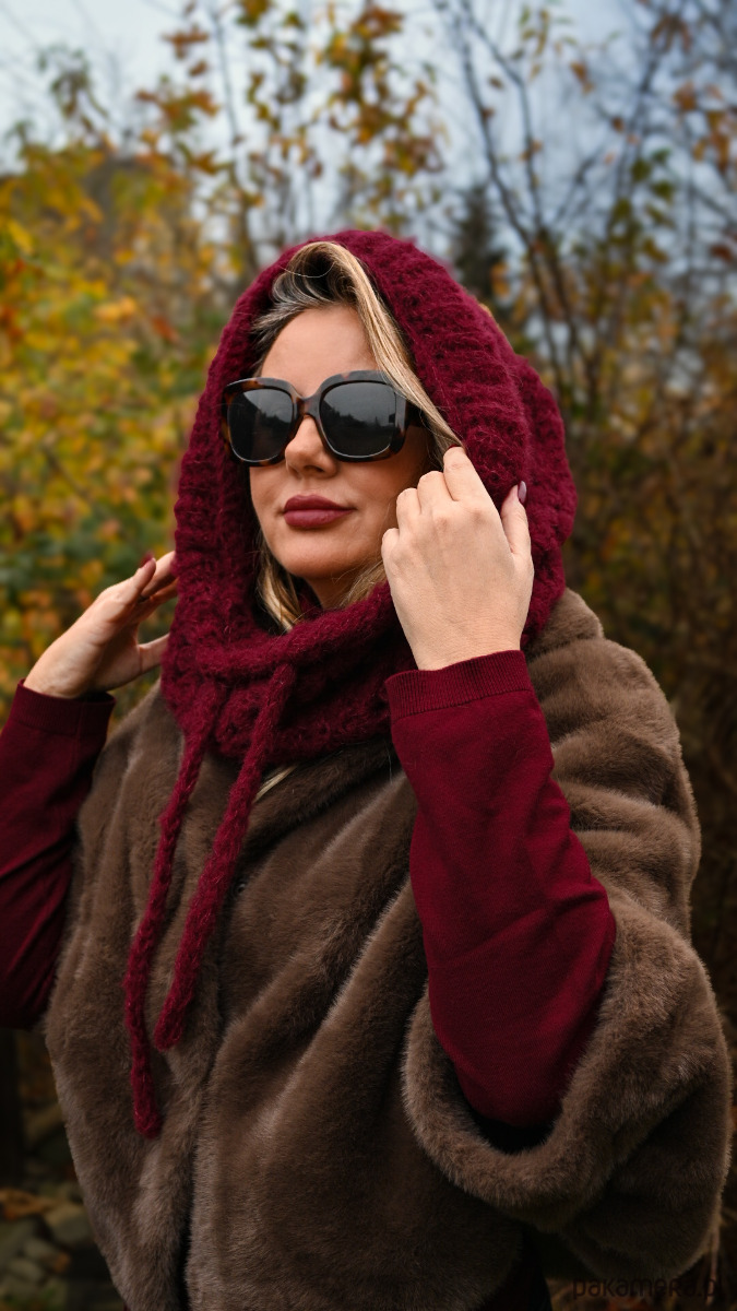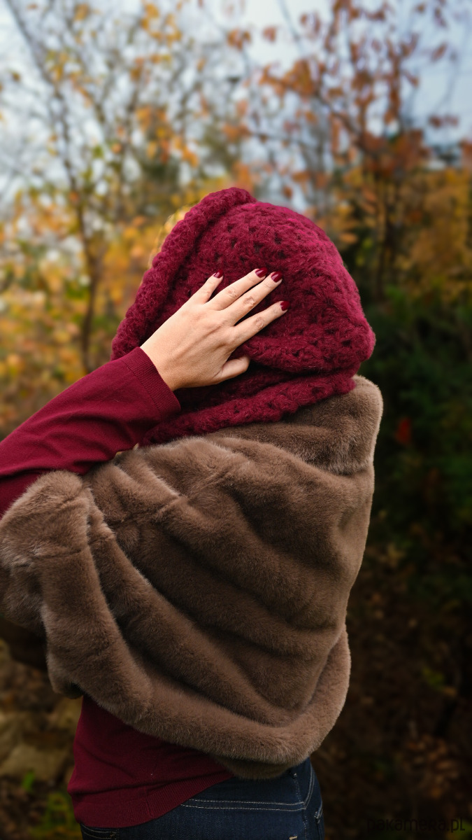 Przedstawiamy unikalną, ręcznie szydełkowaną balaclavę w głębokim, eleganckim kolorze bordo – idealną na zimowe dni, by dodać stylu i zapewnić ciepło.