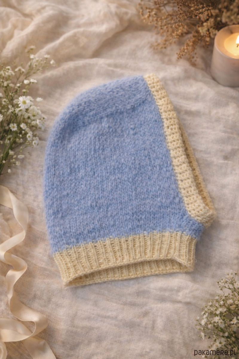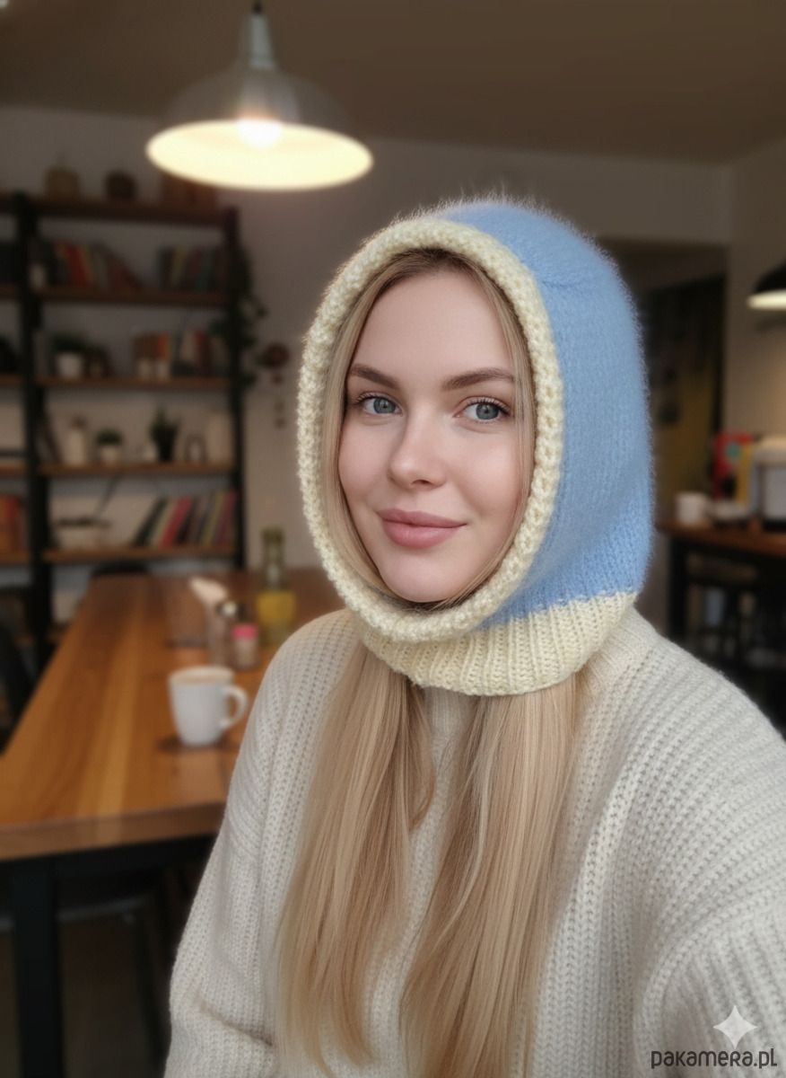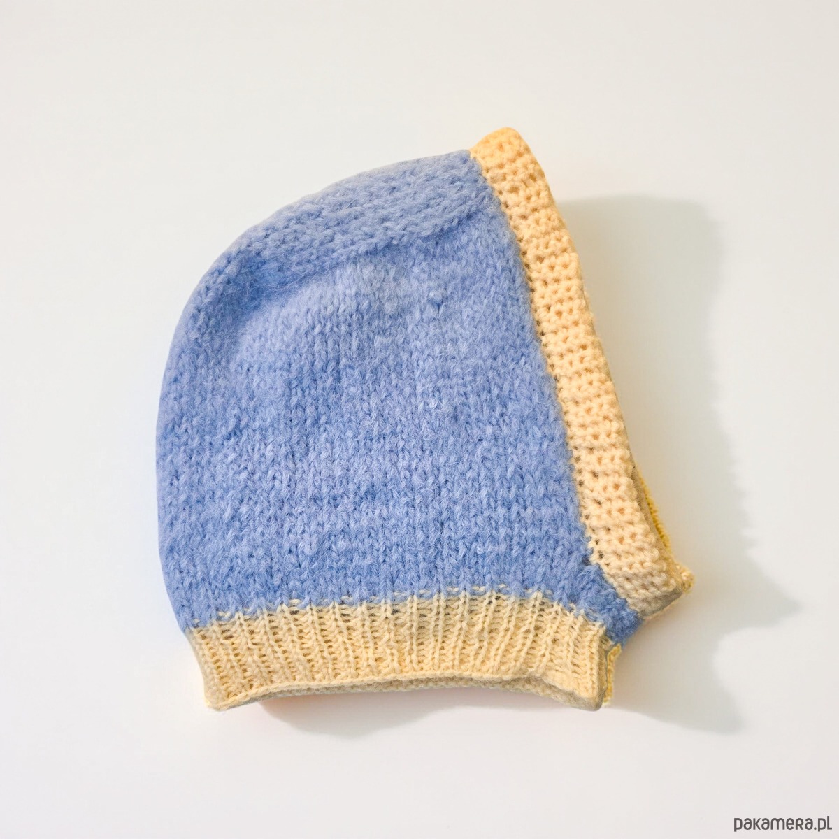 Wyjątkowo ciepła, ręcznie robiona kominiarka w najmodniejszym fasonie sezonu. Połączenie błękitu z kontrastowym wykończeniem w kolorze maślanego żółtego.